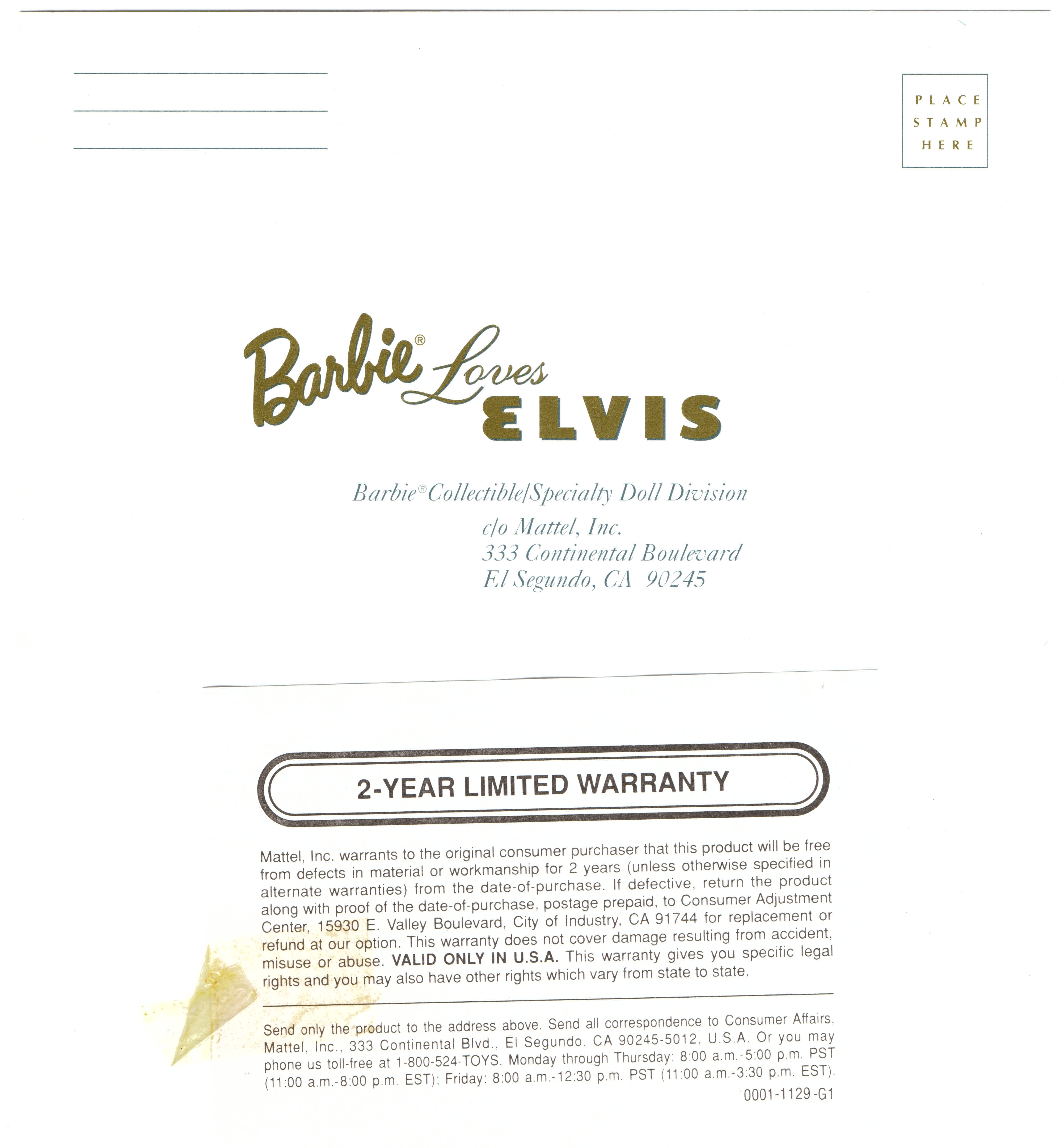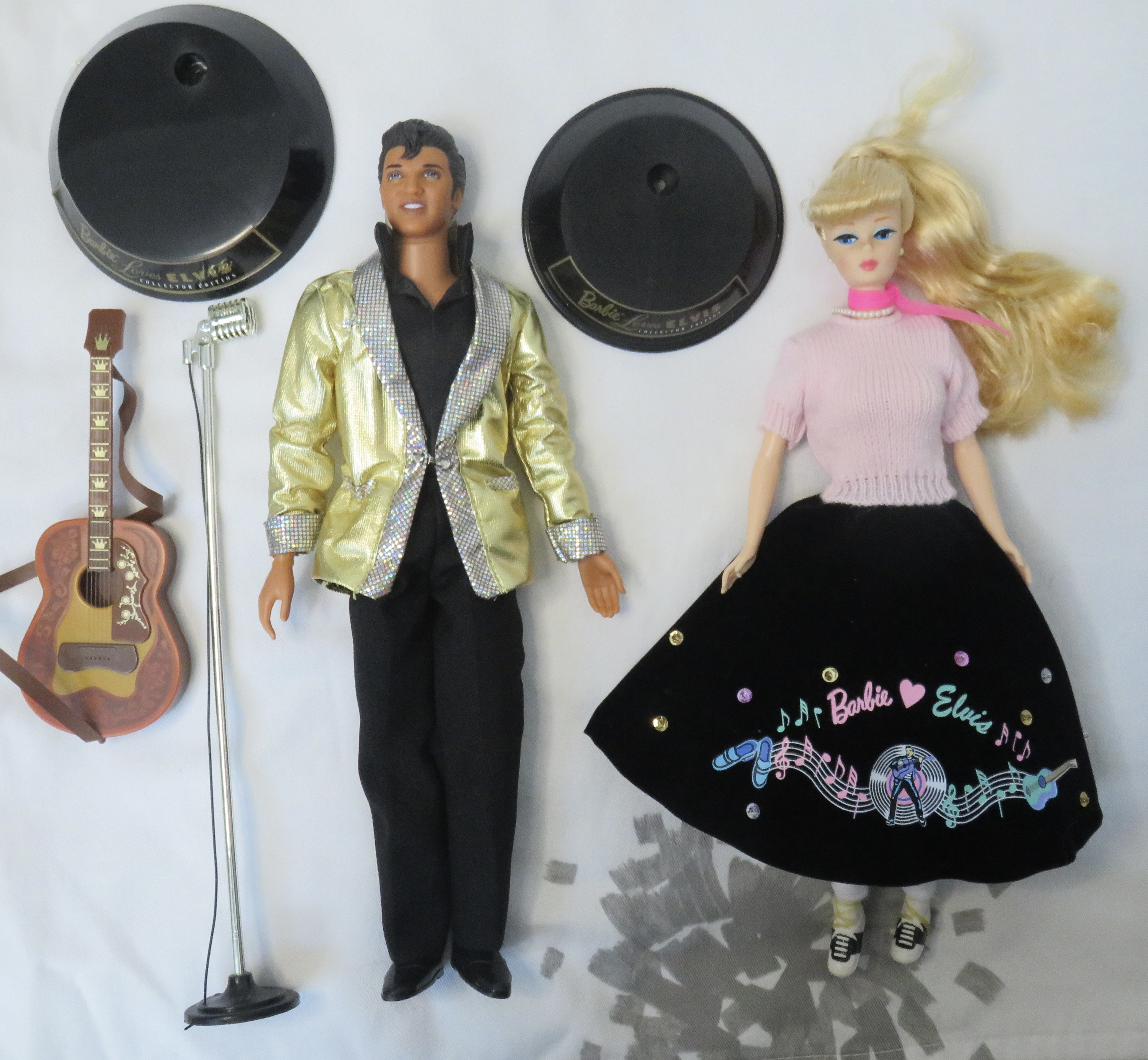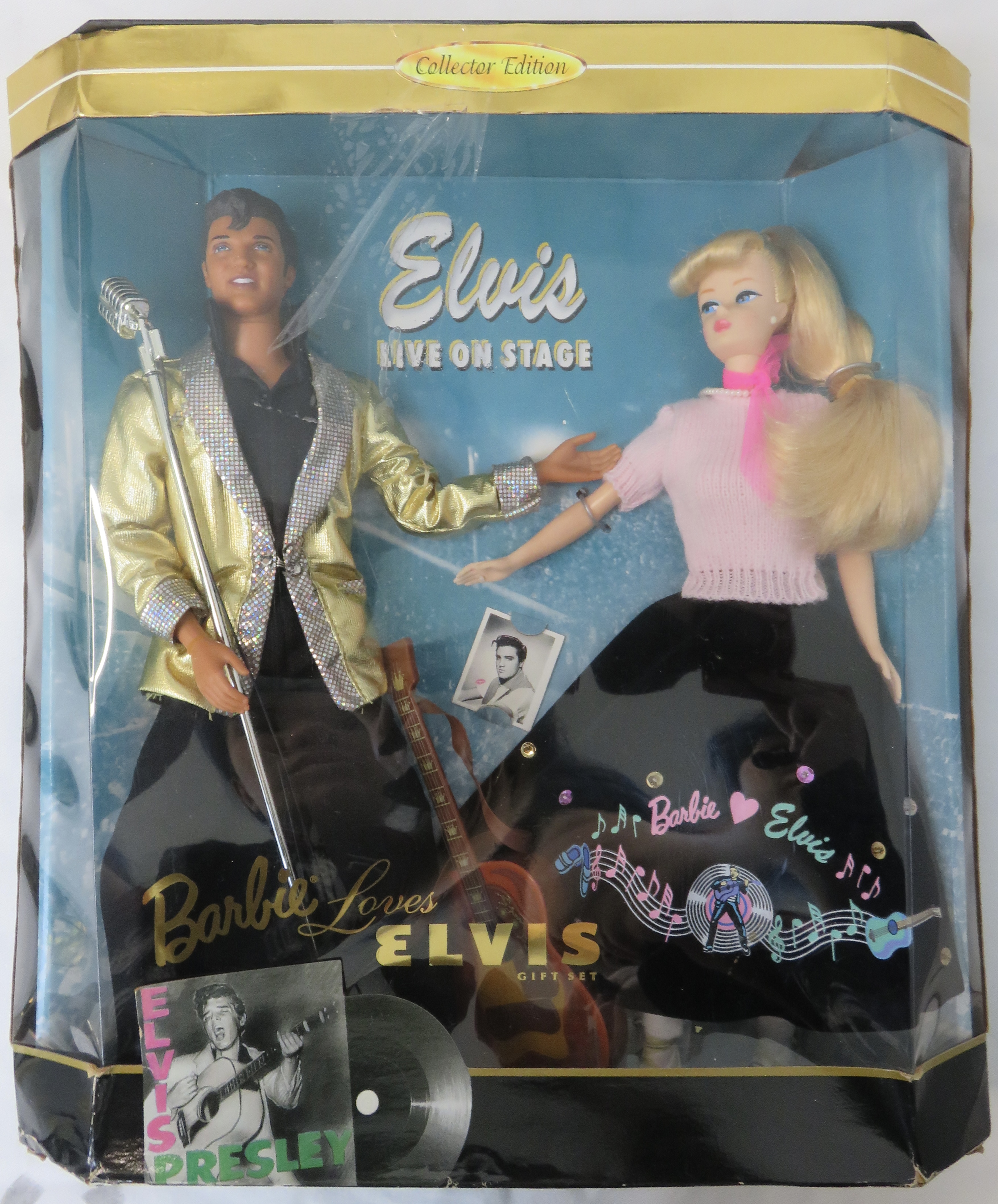 Elvis' guitar was loose in the box, flapping around as I carried the set home. The box has some luminous gold text declaring the name of the set to be "Barbie Loves Elvis." As an added accessory, there is an insert of a black and white photograph of real-life Elvis in the box. Along with the two dolls and their accessories, the box included a saddle stand for Barbie and a claw-style stand for Elvis.