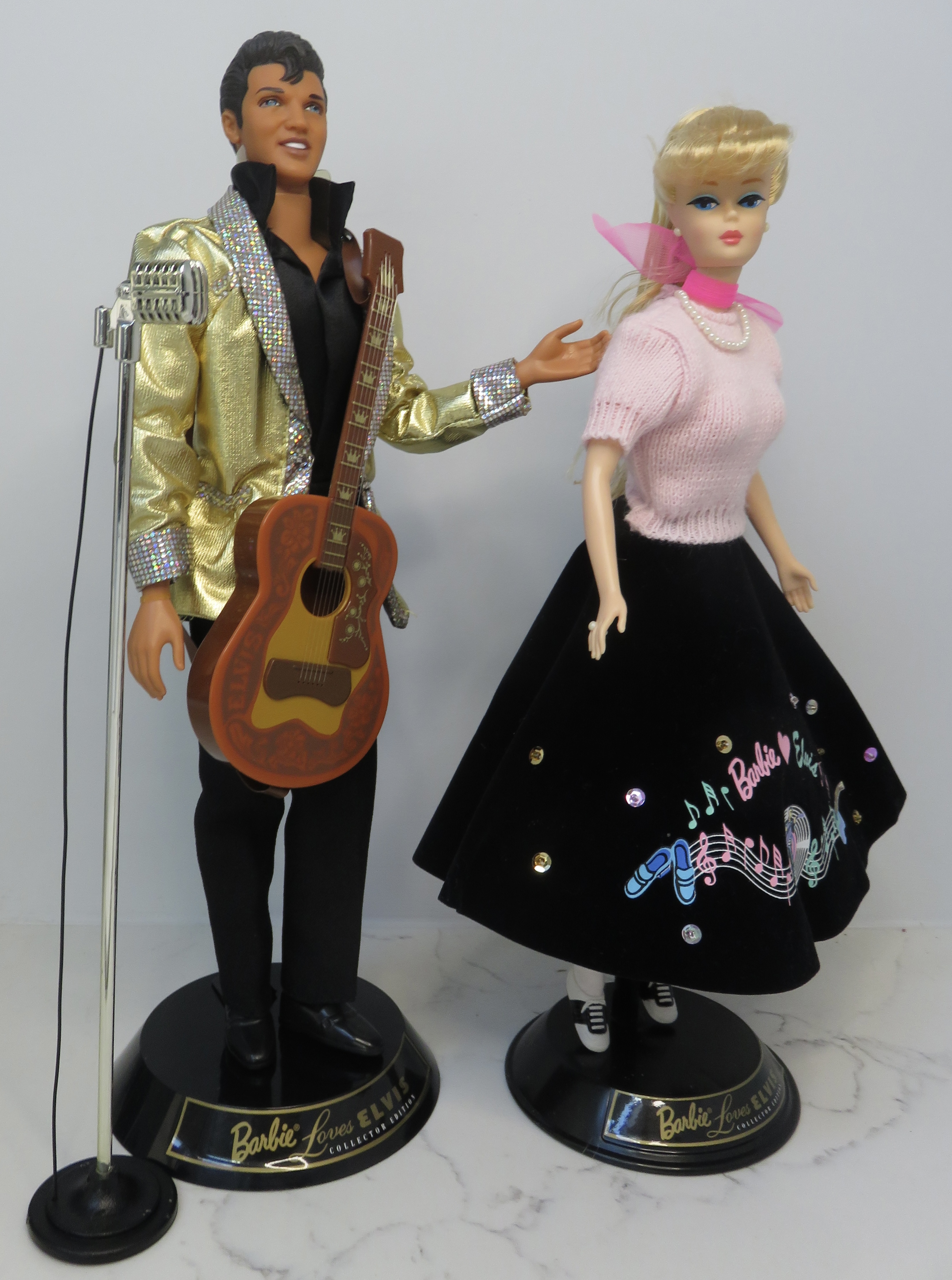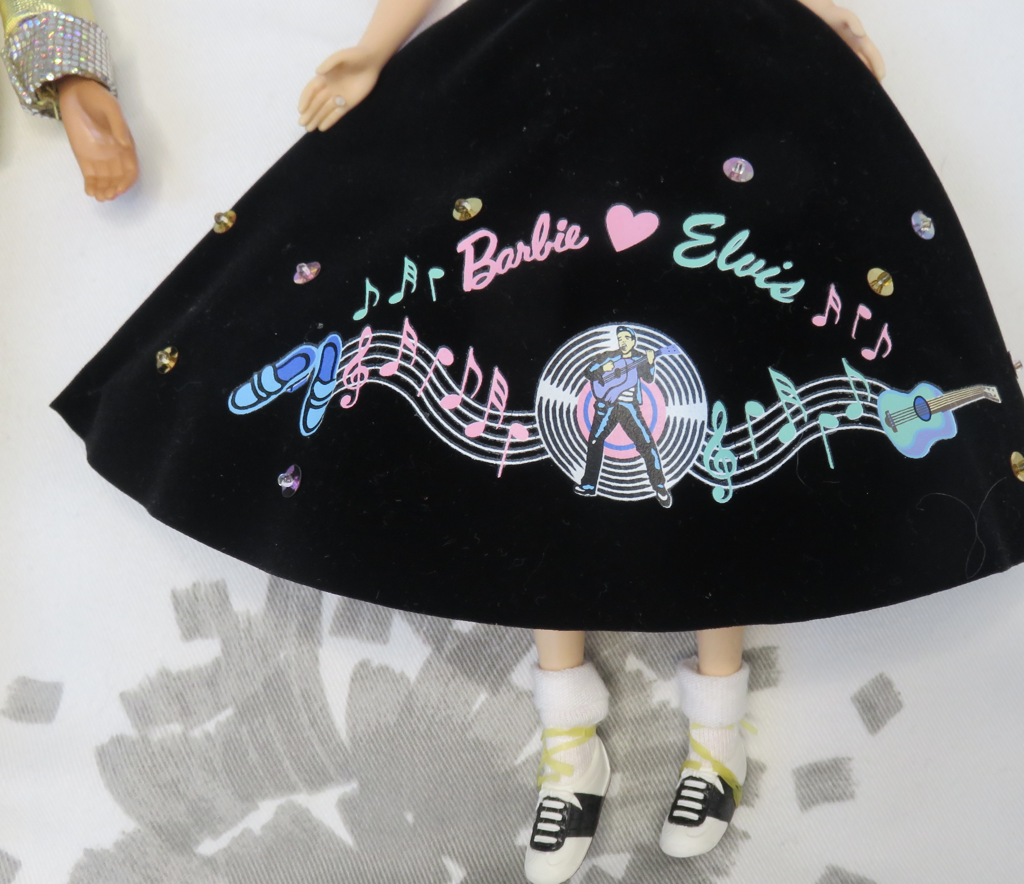 Barbie is very cute. She has blonde hair in a long ponytail and rolled bangs. She wears pearl earrings, a string of pearls around her neck, and a pearl ring on her hand. She has a bright pink scarf around her neck, and she sports a light pink sweater. The real standout piece of her outfit is a black velvet skirt that ends a bit above her ankles. In minty green and pink text, her skirt reads "Barbie (heart) Elvis," surrounded by illustrated music notes. A pair of shoes and guitar serve as endcaps on either side of a wiggly bar of music, lines and spaces populated by mint and pink music notes. A emblem showing an image of Elvis playing his guitar in front of a vinyl record stands in the middle of the design. Some colorful sequins dot the rest of the skirt, and the shape of the skirt is made full by a pink crinoline underneath.