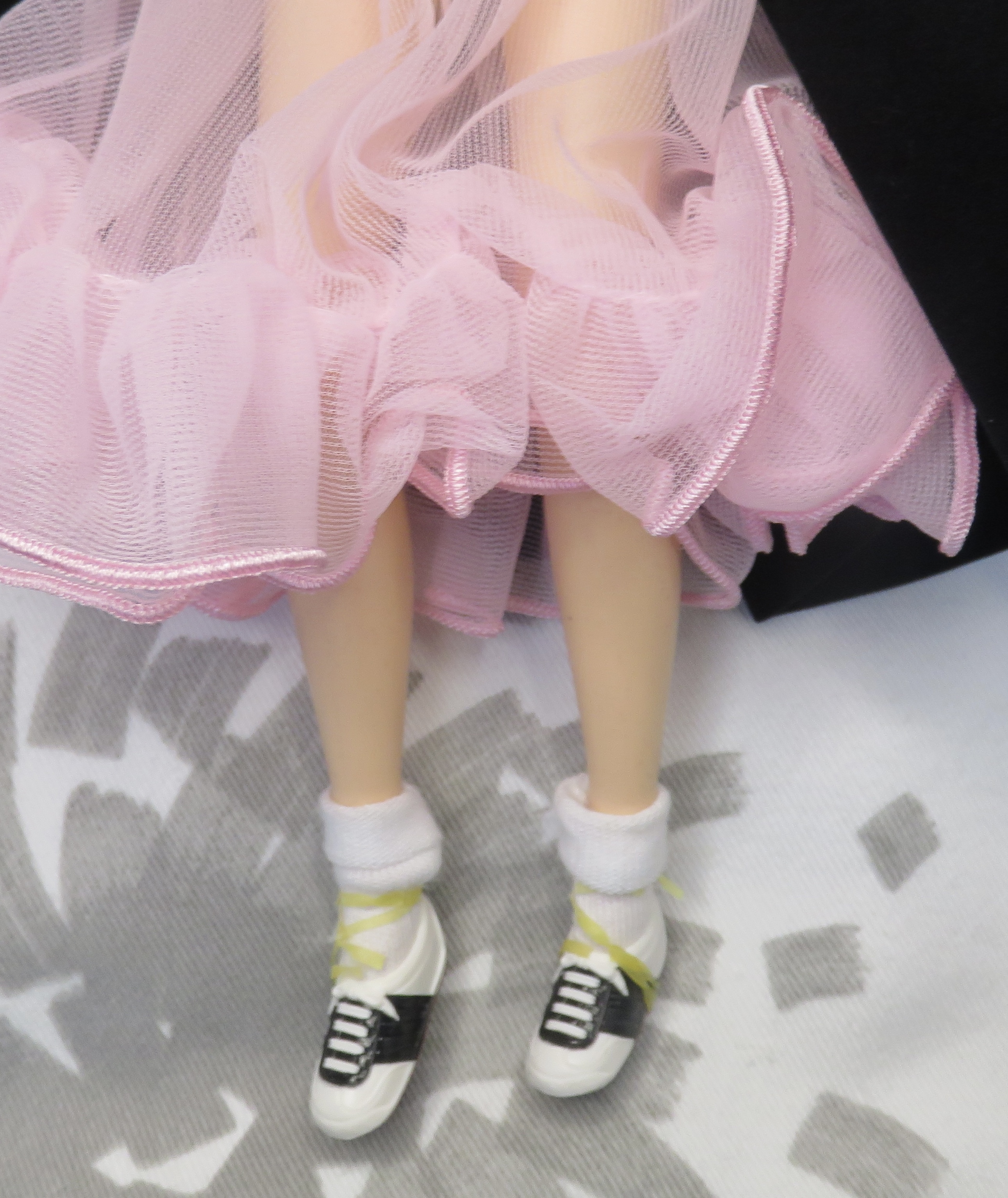 They were a little sticky coming out of the box, but they had clearly never been opened. The package was held together by yellowing tape, crusty and having lost any tackiness. Barbie's hair was gluey and neeed a wash. The stickiness, whatever it was, held on tightly to the brittle, cracking elastic bands that once held her hair style together. Yellow bands also secured her shoes, but they were easily picked off. Elvis was in pretty good condition, aside from one rubber band flaking off his jacket, taking a small patch of gold off with it.