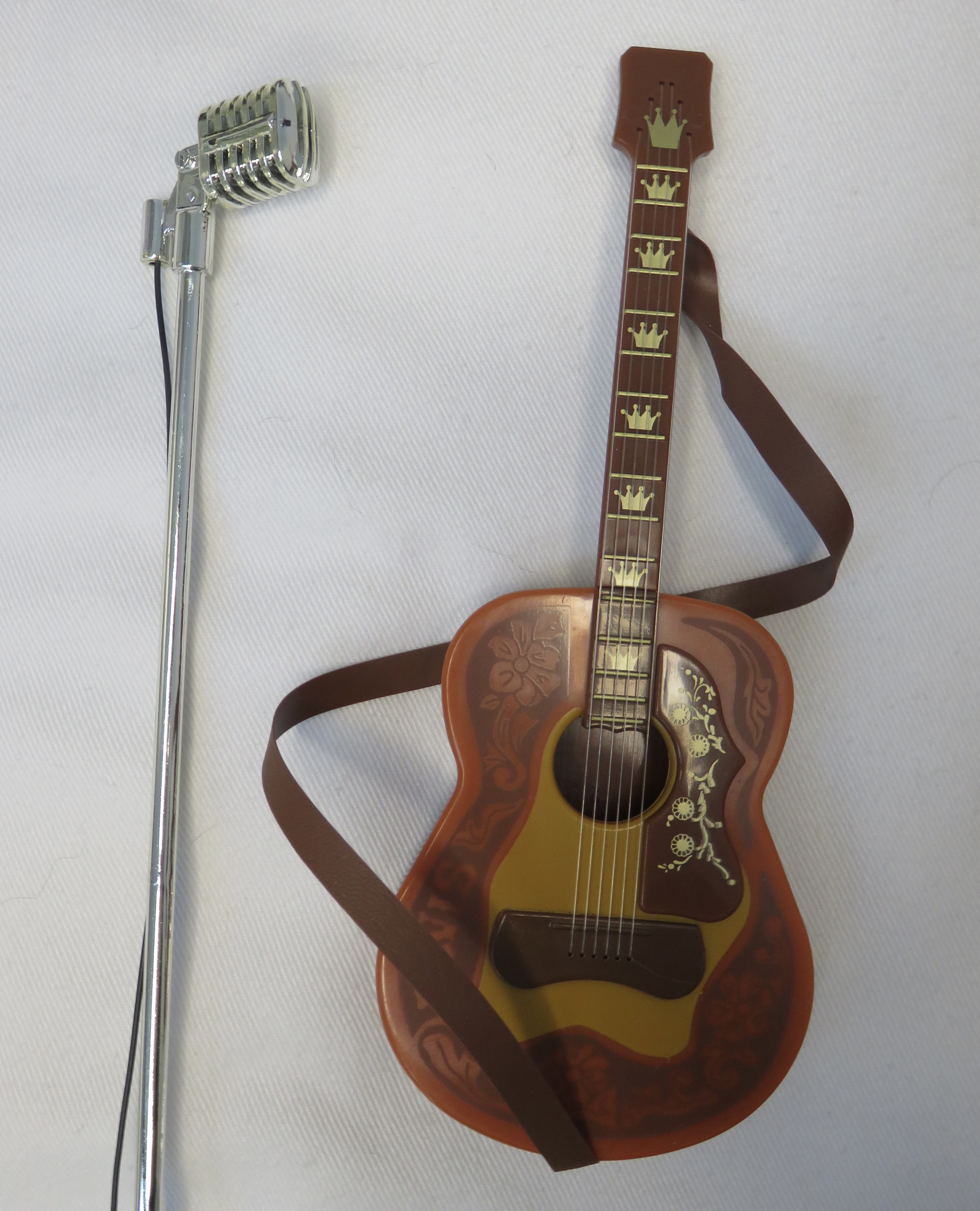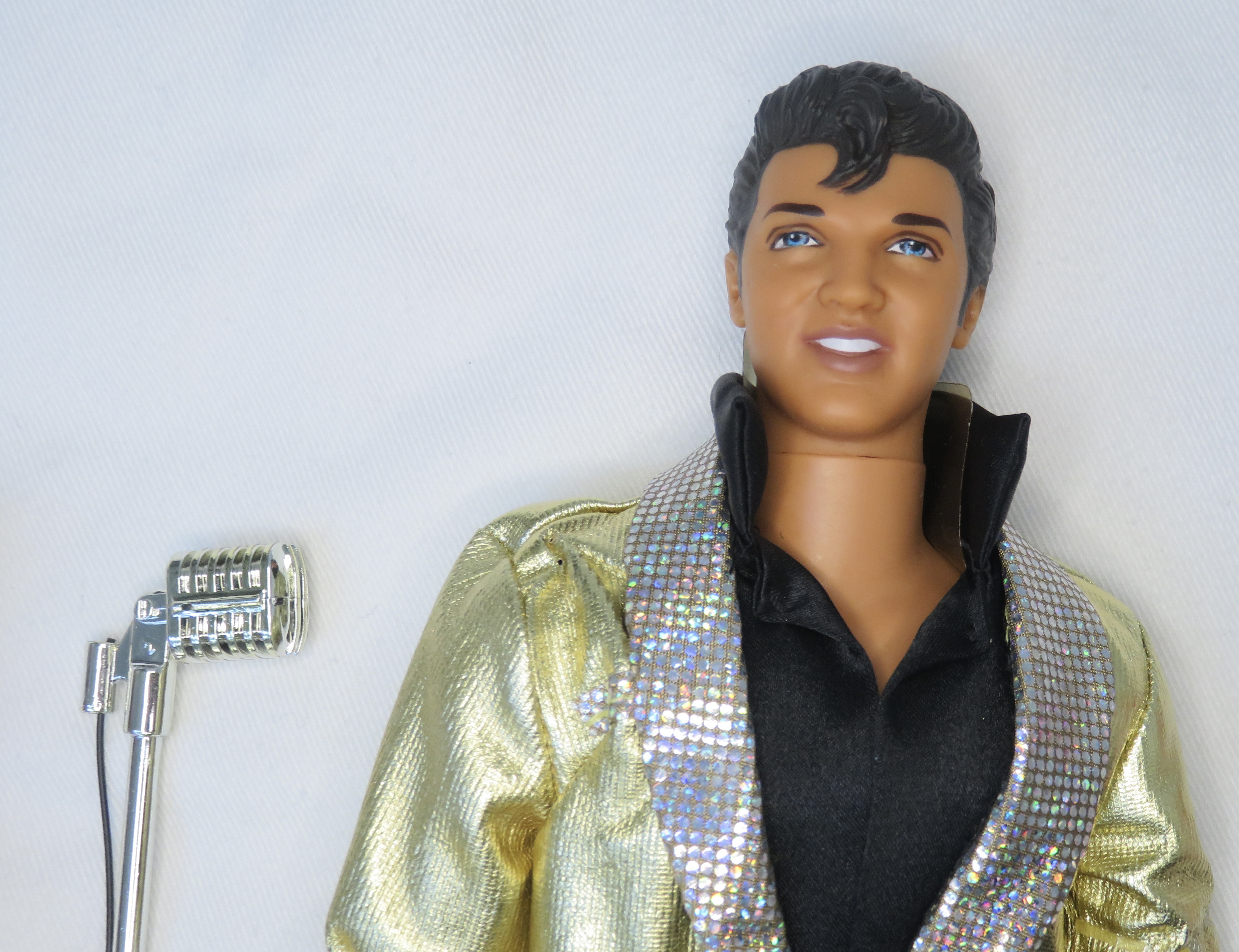 Elvis himself is alright, and is mostly remarkable for being Elvis. Not every celebrity doll captures its namesake's likeness as well as this Elvis doll does. He wears a gold suit jacket with silver lapels. He has a black silky shirt with a popped collar underneath his jacket, and mtching black pants and shoes. He has a microphone and guitar.
