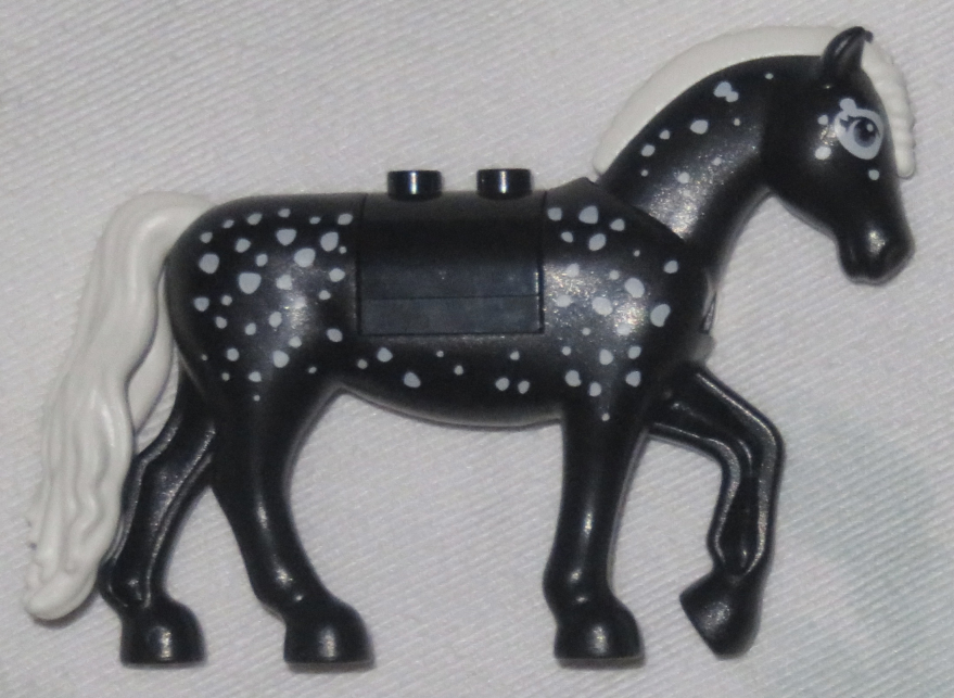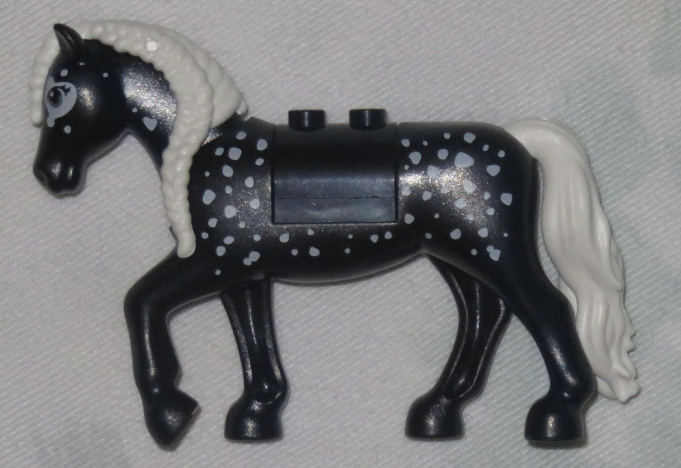 This LEGO Friends horse is very beautiful... Its black body is elongate and elegant looking, with graceful, long limbs. One front hoof is lifted, and one back hoof stretches backwards, subtly. The horse's body is covered in a smattering of white spots, and it has a white heart shaped spot over one of its blue eyes. Its detailed white hair is made of some rubbery kind of plastic. One can squish it, a little bit, and wiggle the end of its braid. I like that this horse seems to have textured hair. The tail does not share the same sculpted texture, but is made of the same squishy material.