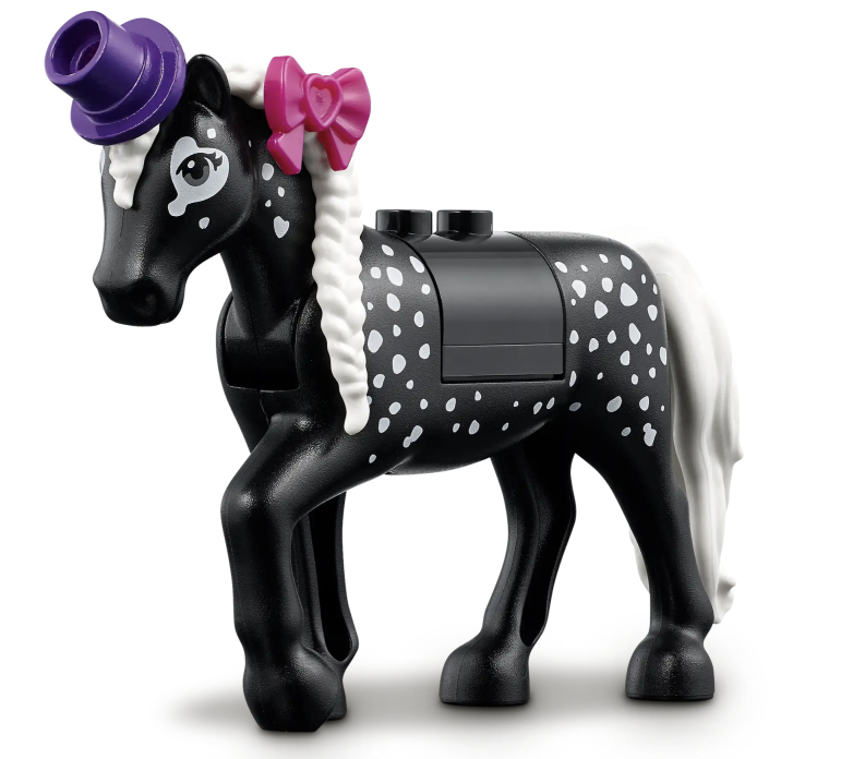 This horse belongs to the LEGO Friends "Magical Acrobatics" set, and is meant to wear a tiny horse top hat and bow.