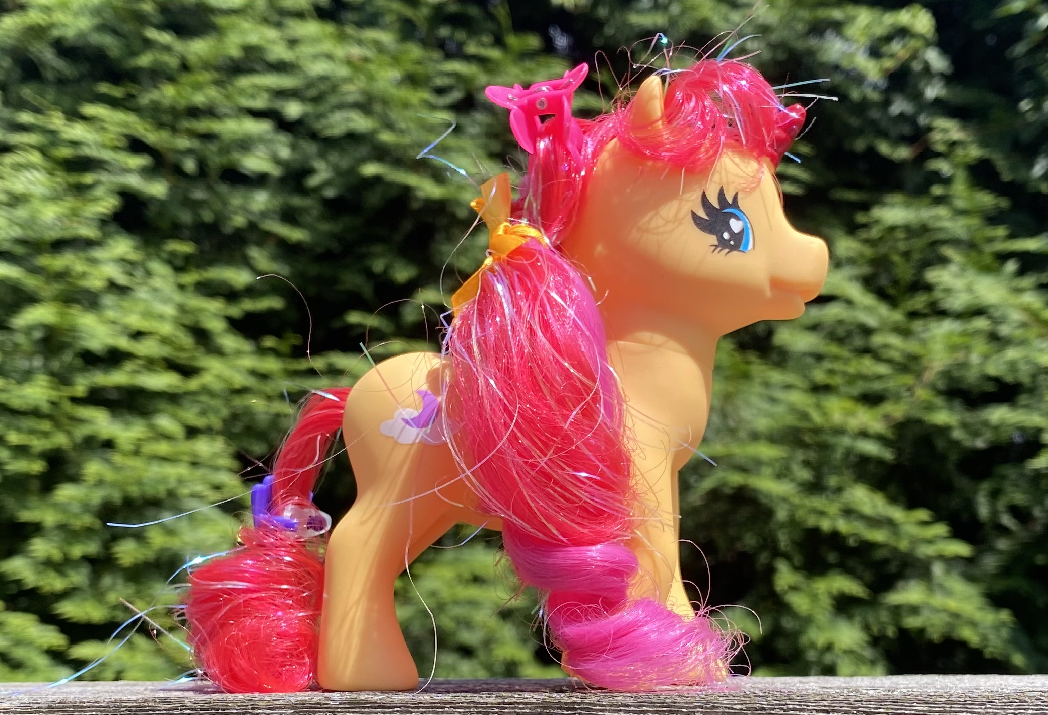 She came with several hair accessories in her thrift store bag, including a pink clip-in hair extension that looks quite cute on her.