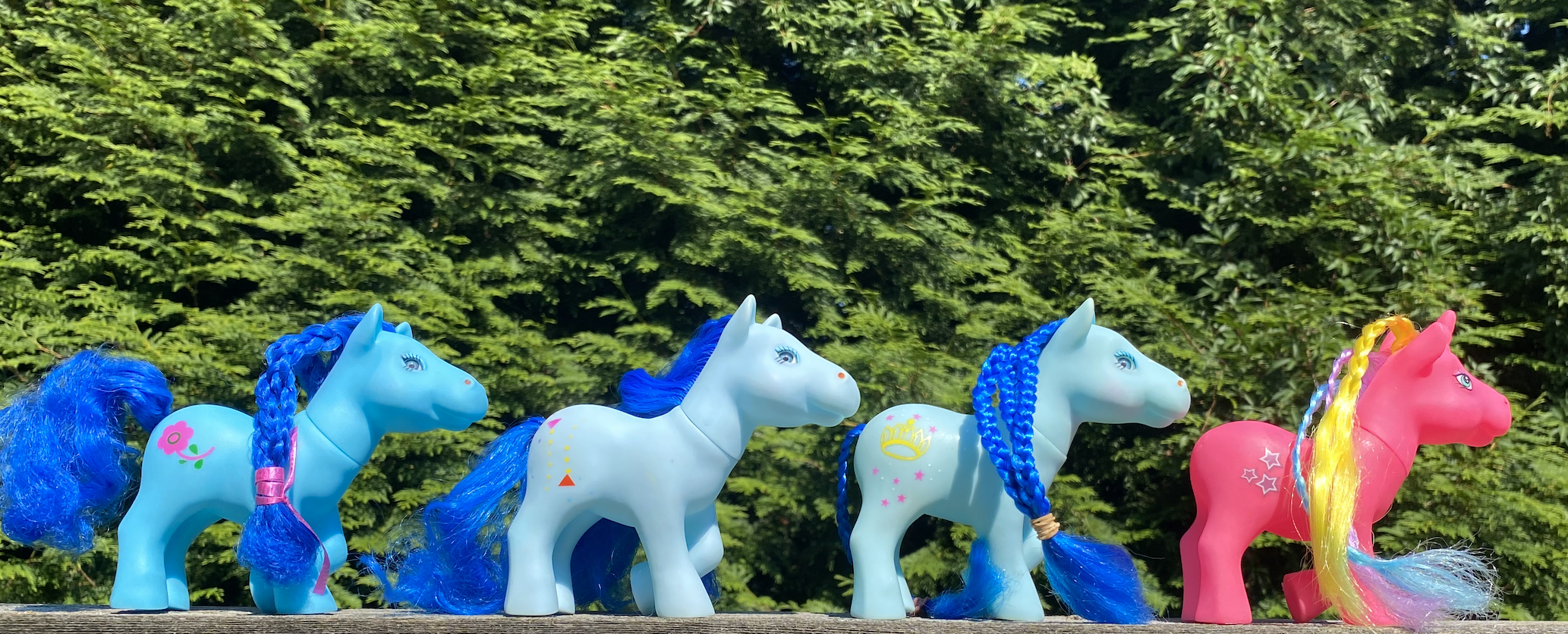 The blue ponies are all pretty similar with various shades of light blue bodies and darker blue hair. They all identical stripes on their noses.
