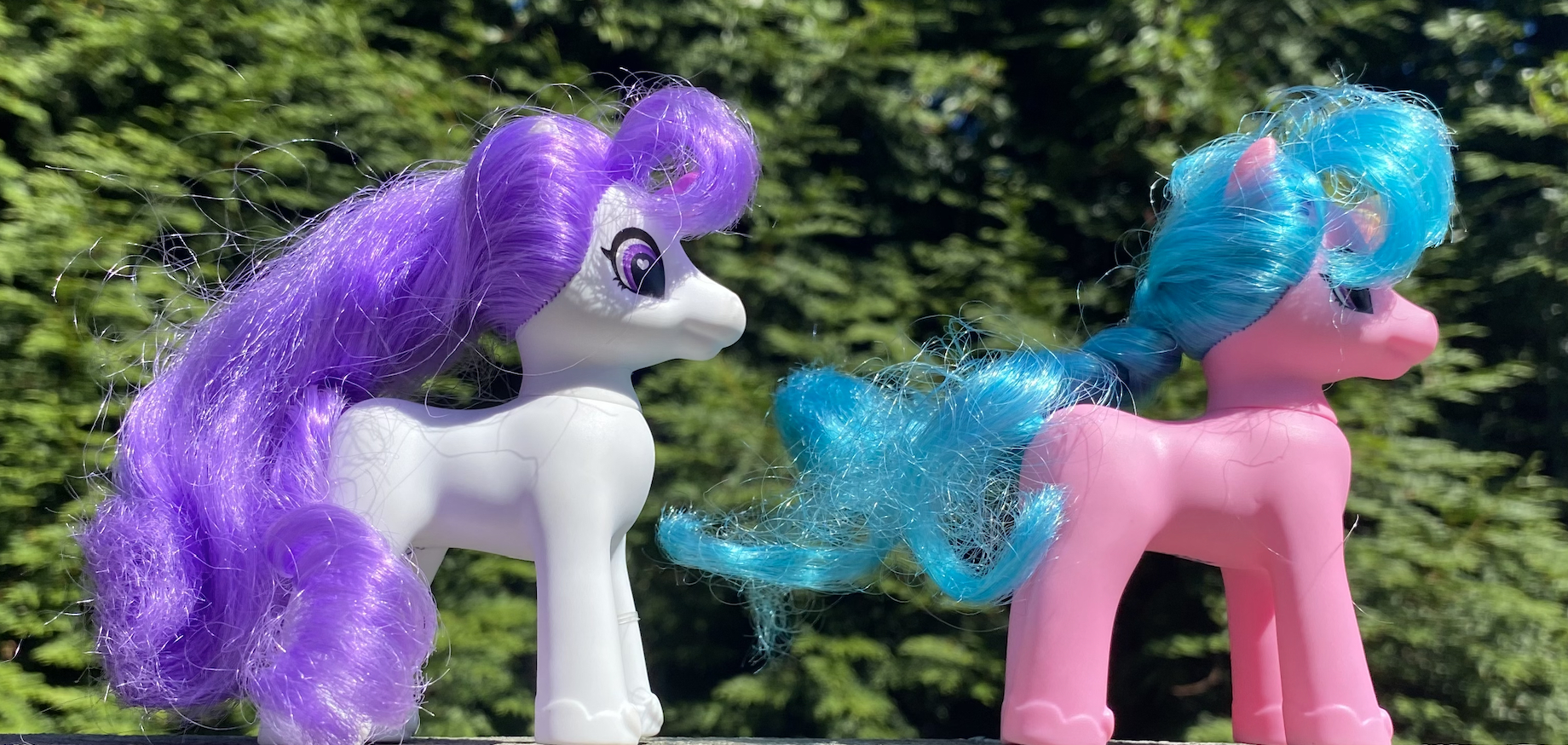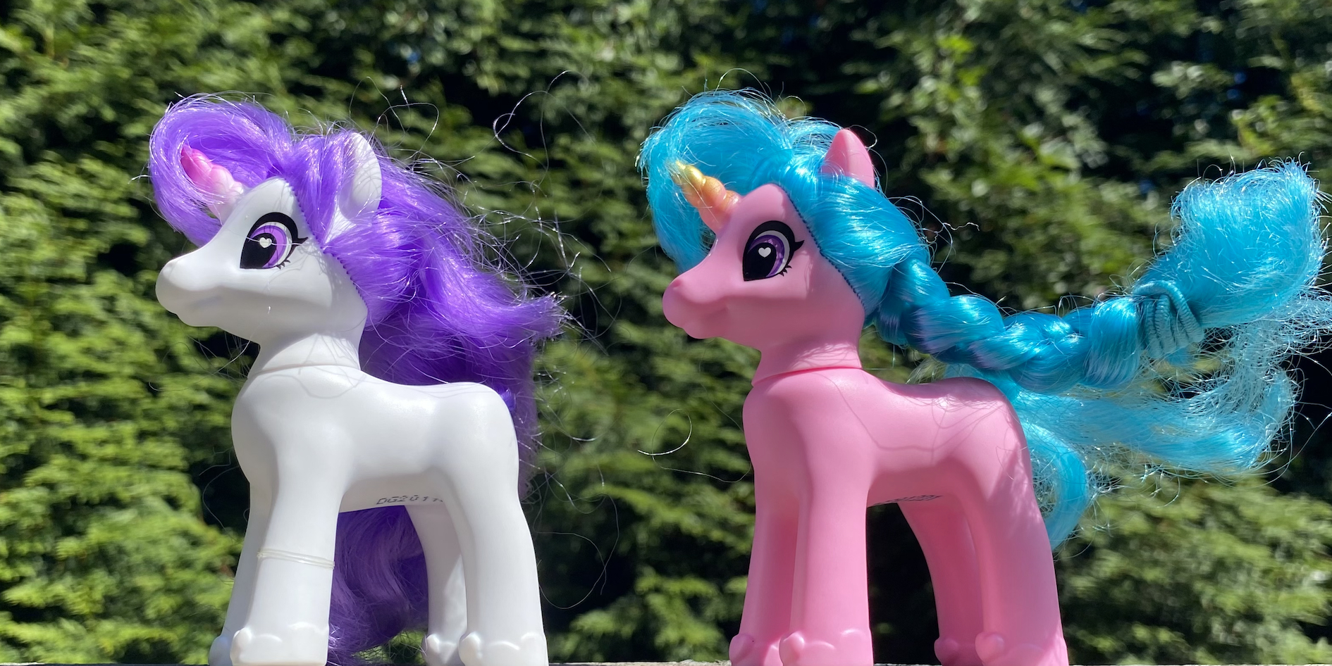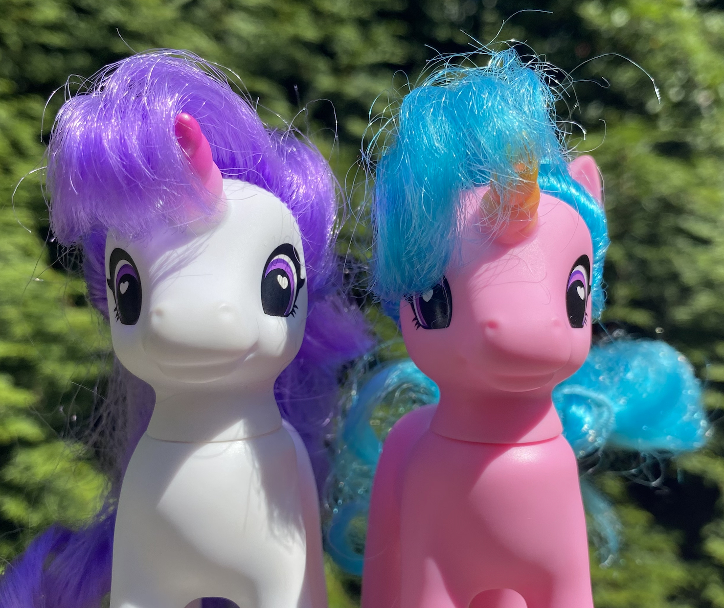 I found two unarticulated unicorns at the thrift store-- one white with purple hair, and one pink with blue hair.