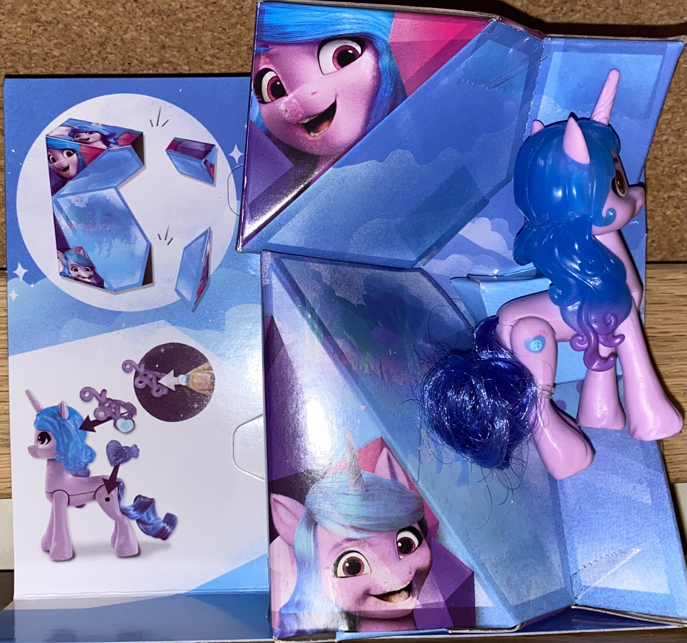 Izzy has molded hair in the front and a brushable tail in the back. As usual, she's really cute! This Izzy has articulated legs and unpainted hooves.