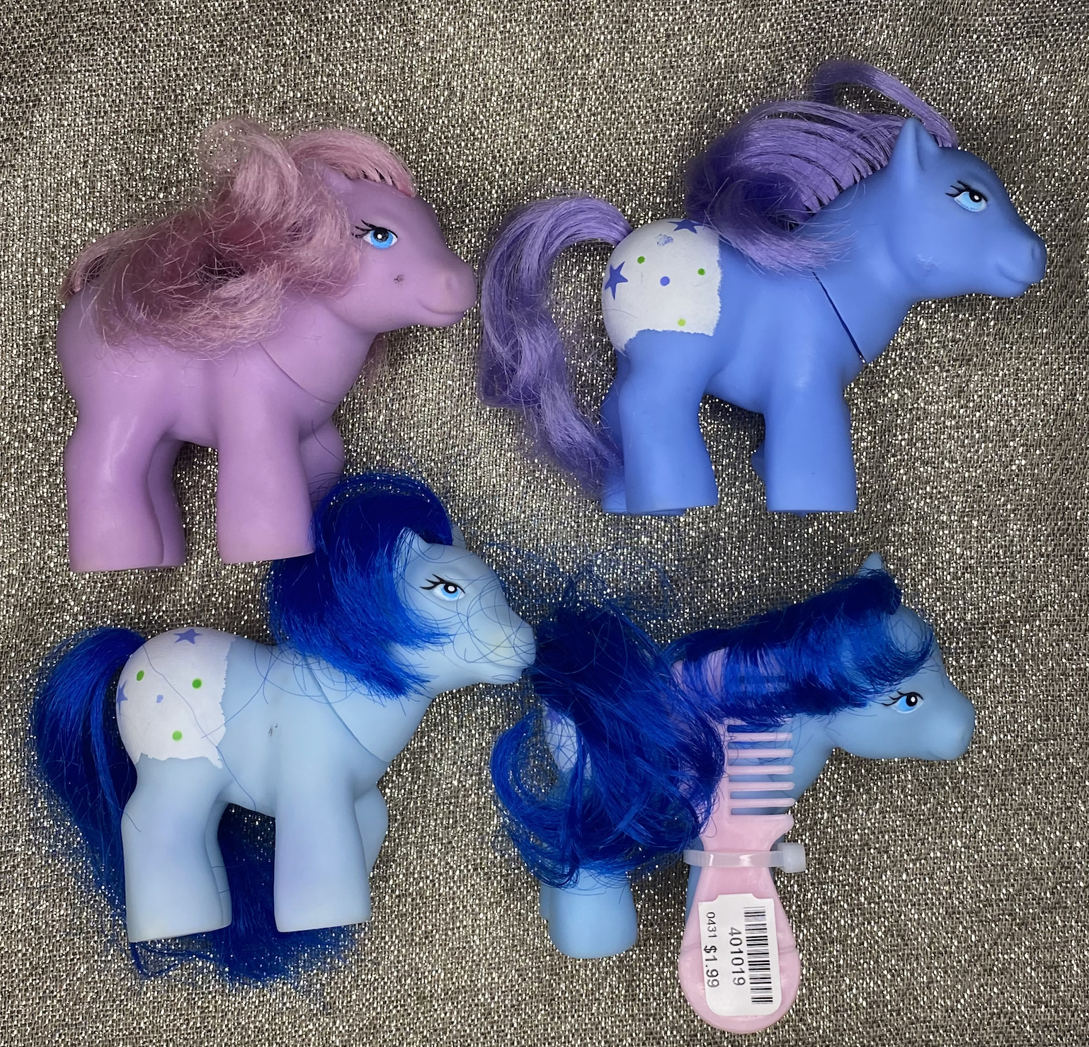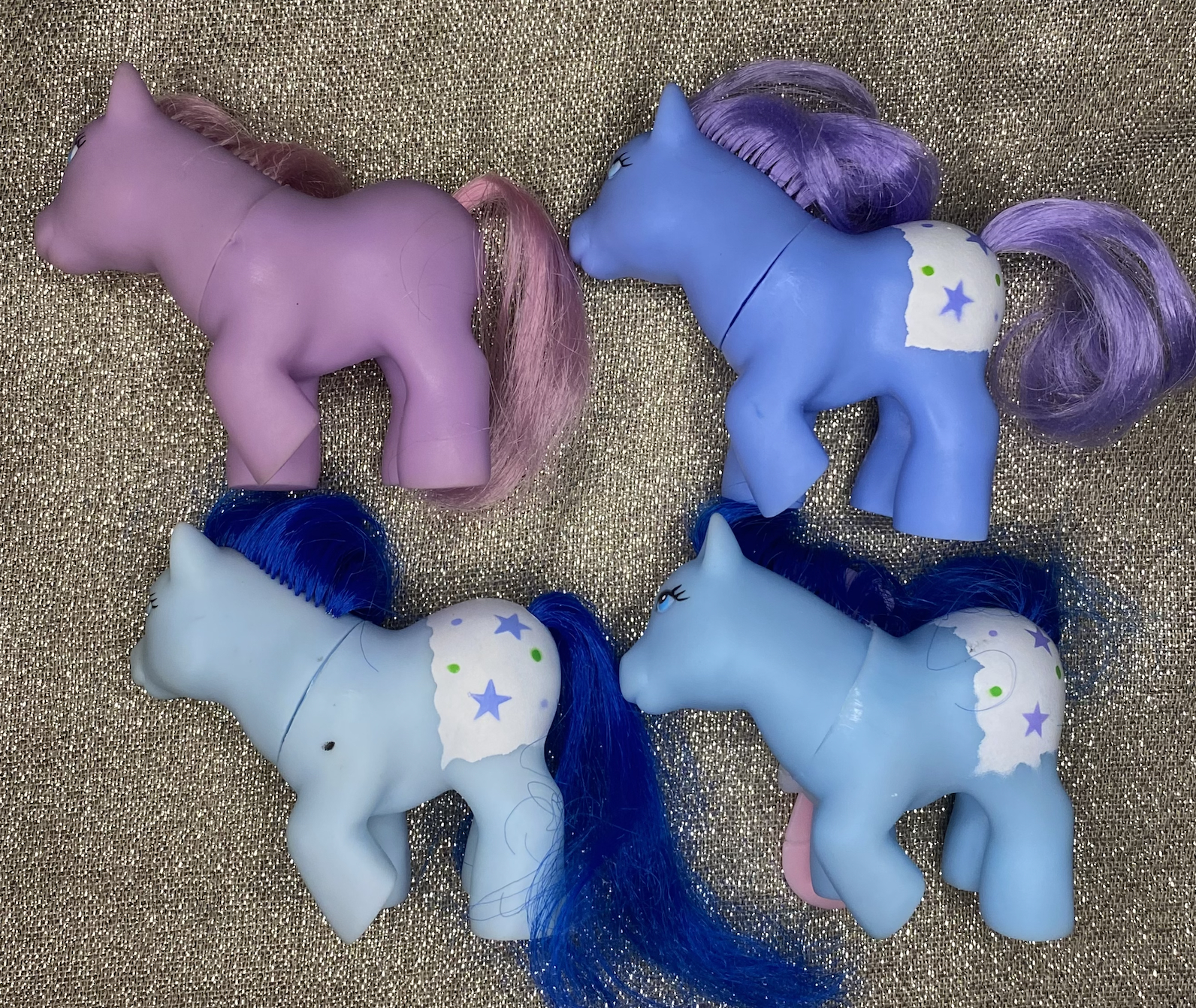 Though the purple pony lacks undergarments, it is still included in this bunch with its brethren. They all have the same raised hoof pose, small heads, and painted eyes.