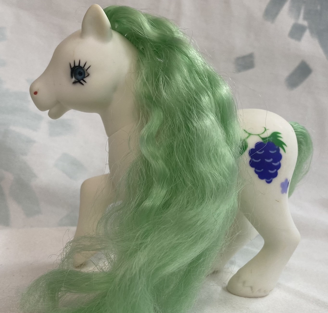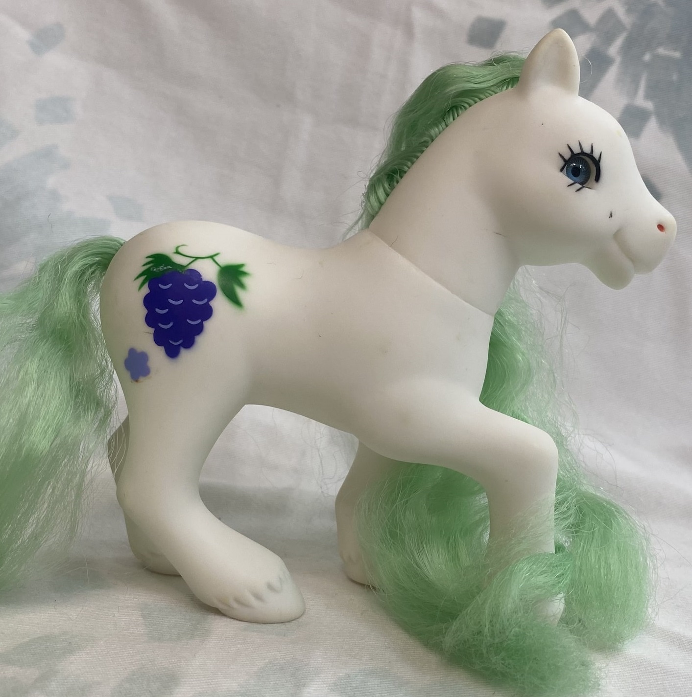 This first white pony is elegant with long, detailed legs and thick green hair. She has a cutie mark of a cluster of grapes on a vine, which is quaint and uncommonly tangible, as far as fakie cutie marks go.
