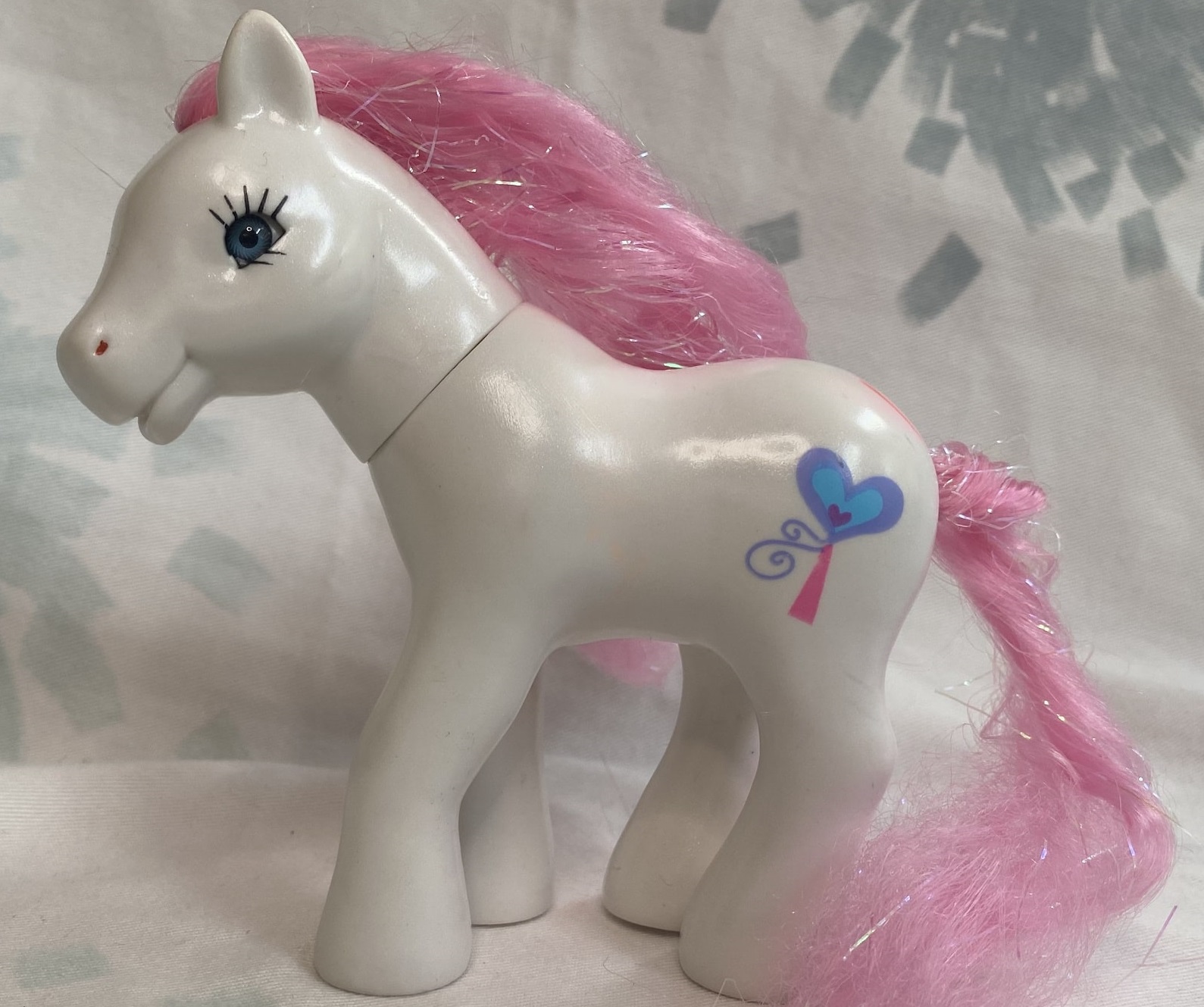 This pony's hair has tinsel mixed into it and her body is glossy and smooth. She seems to have a kind smile.