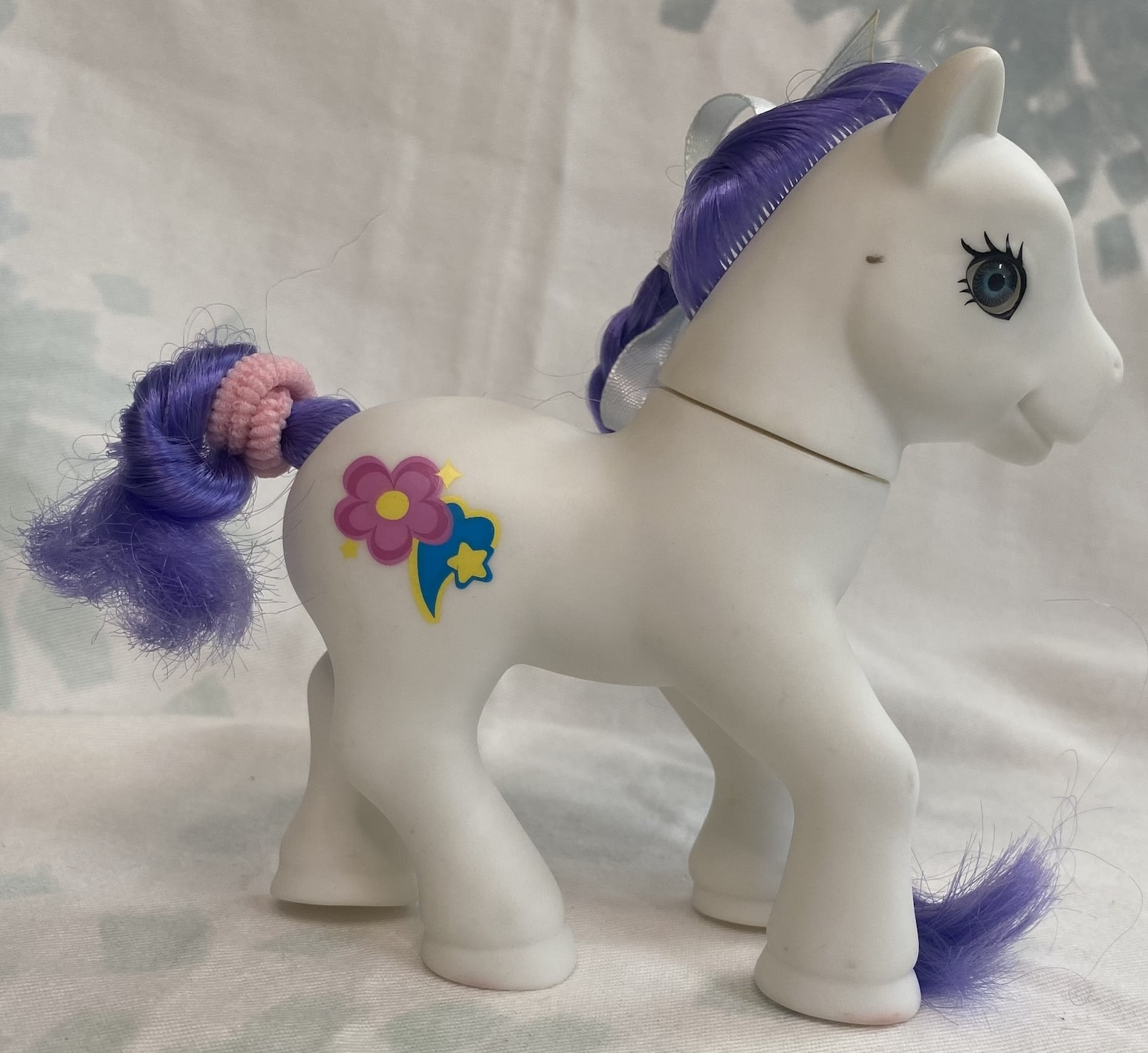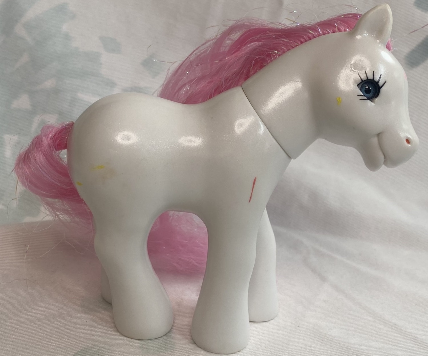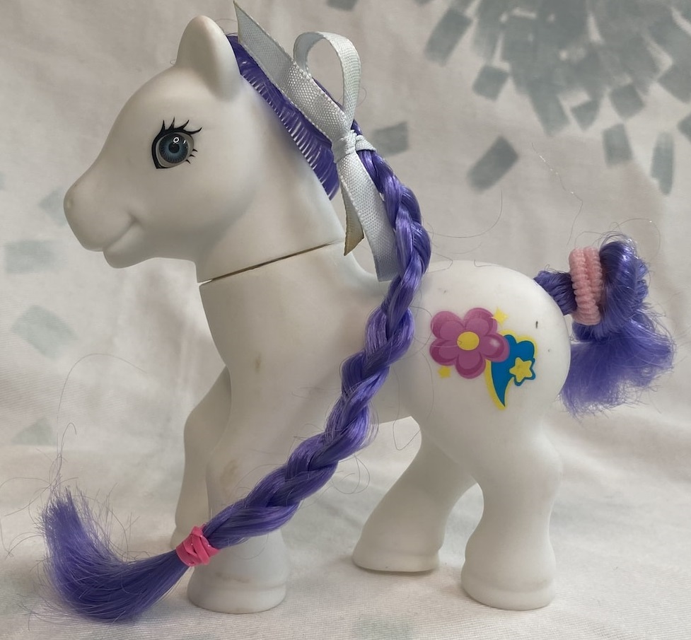 She came with some kind of colorful spiky ball hair ornament tangled in her mane. It seems likely that her previous owner had put it there, since it was also unfortunately full of human hair.