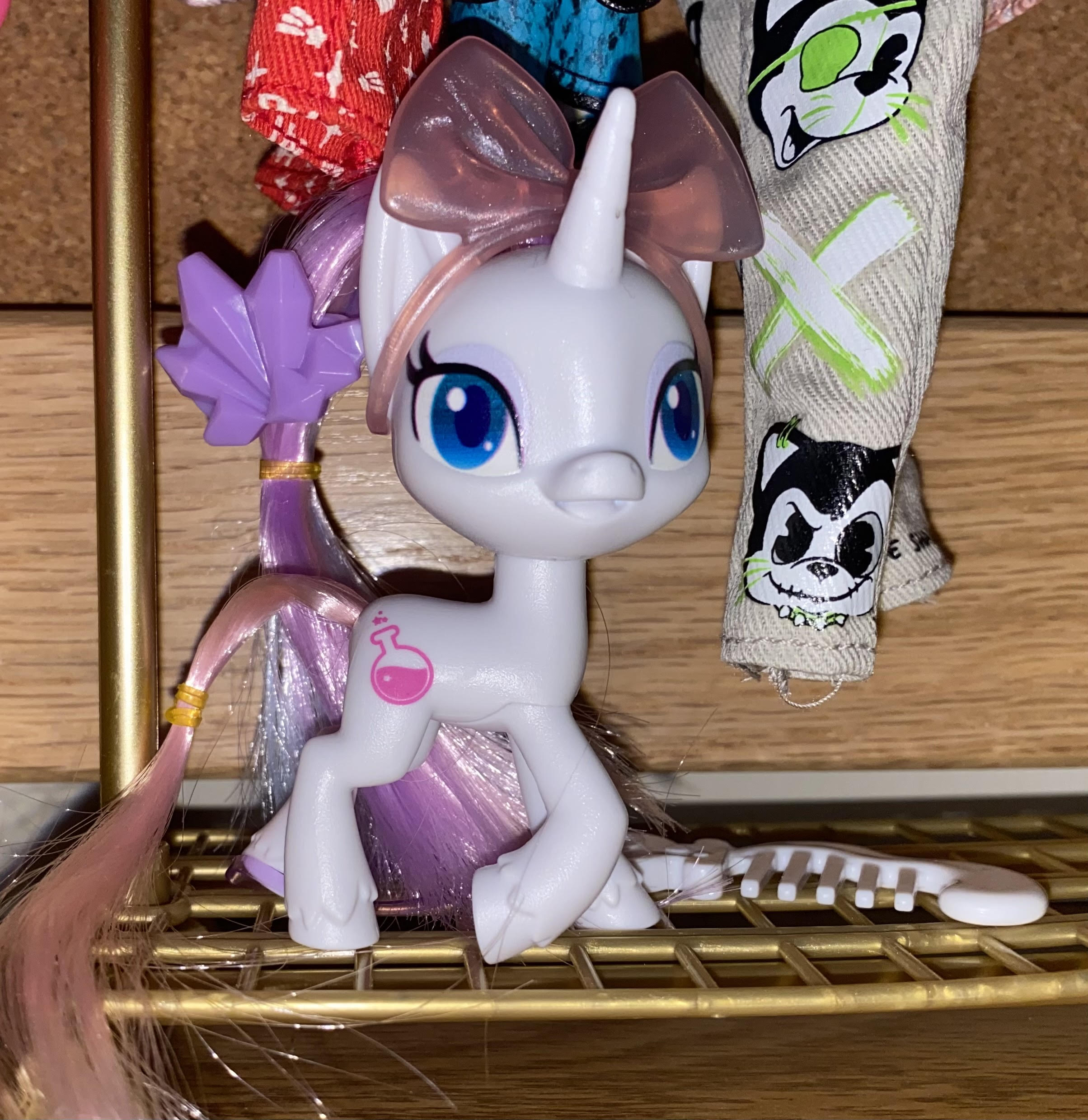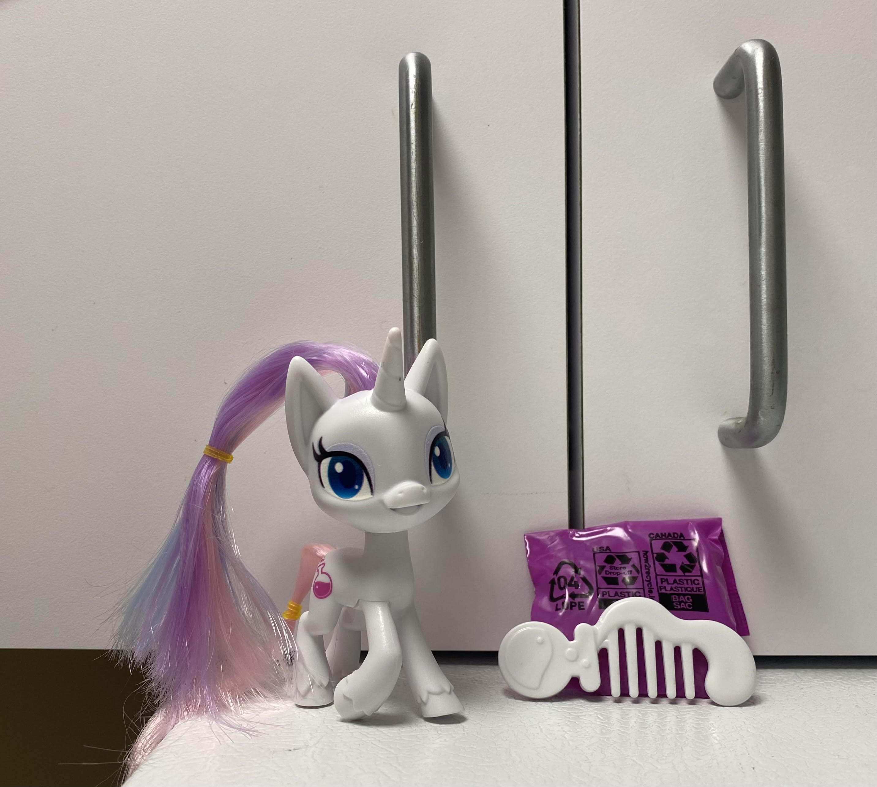 Here is the pony, comb, and purple baggie released from the package. The purple bag contained a big pink bow headband and crystal shaped hairclip.
