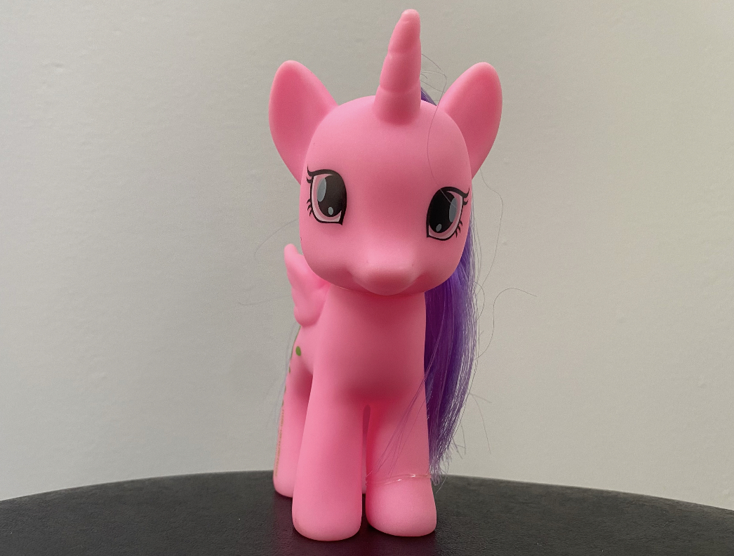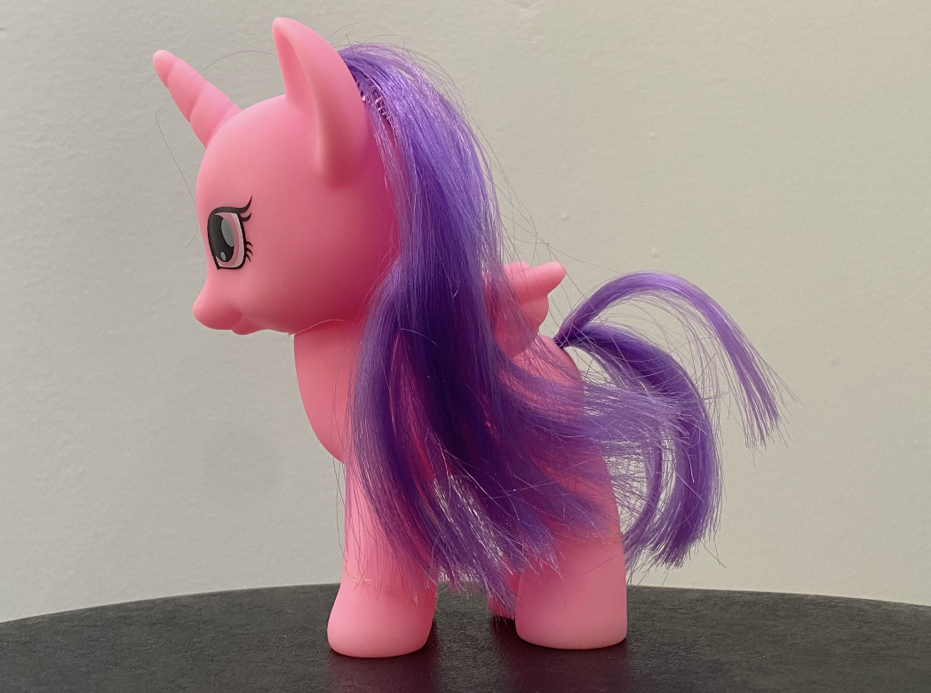 This is a G4 Fashion Style fakie alicorn-- it is pink, with pink eyes, and purple hair. Its eyes and cutie mark are styled after the MLP Character, Princess Luna, though this pony's cutie mark is much smaller, as well as being lime green. Princess Pink's cutie mark takes up a lot less real estate on her leg than Luna's does. This pony, like most others in my collection, was found secondhand.
