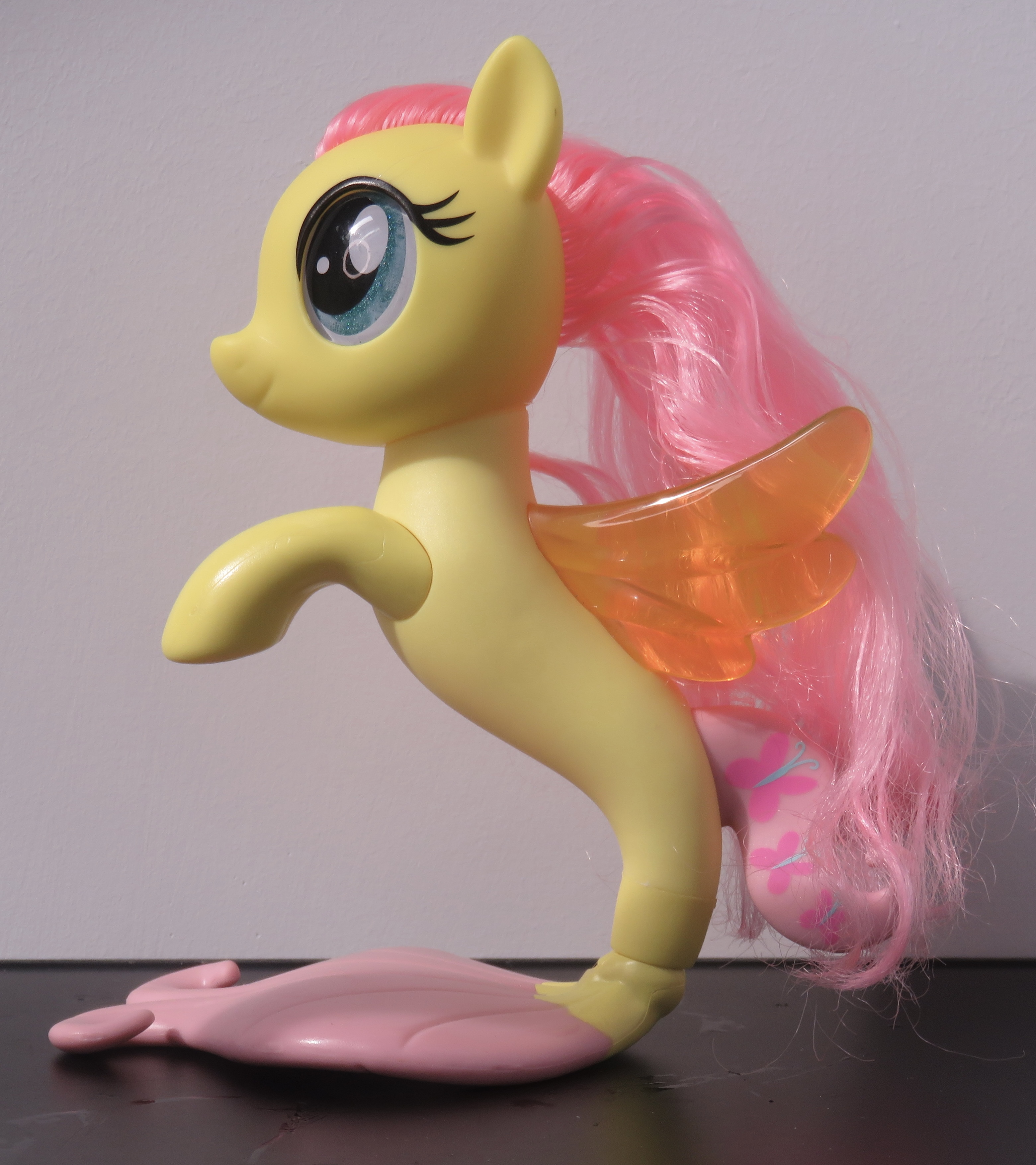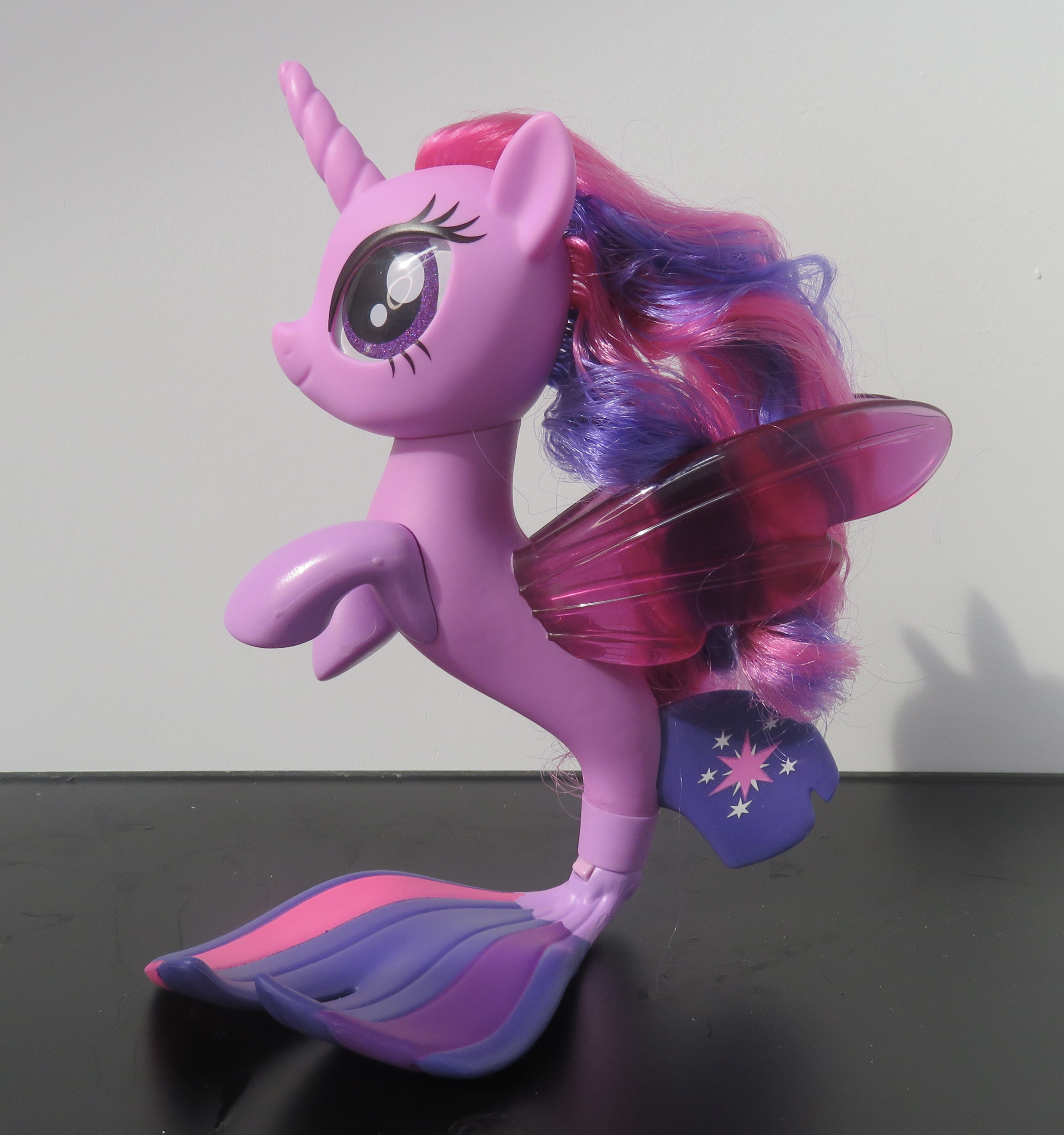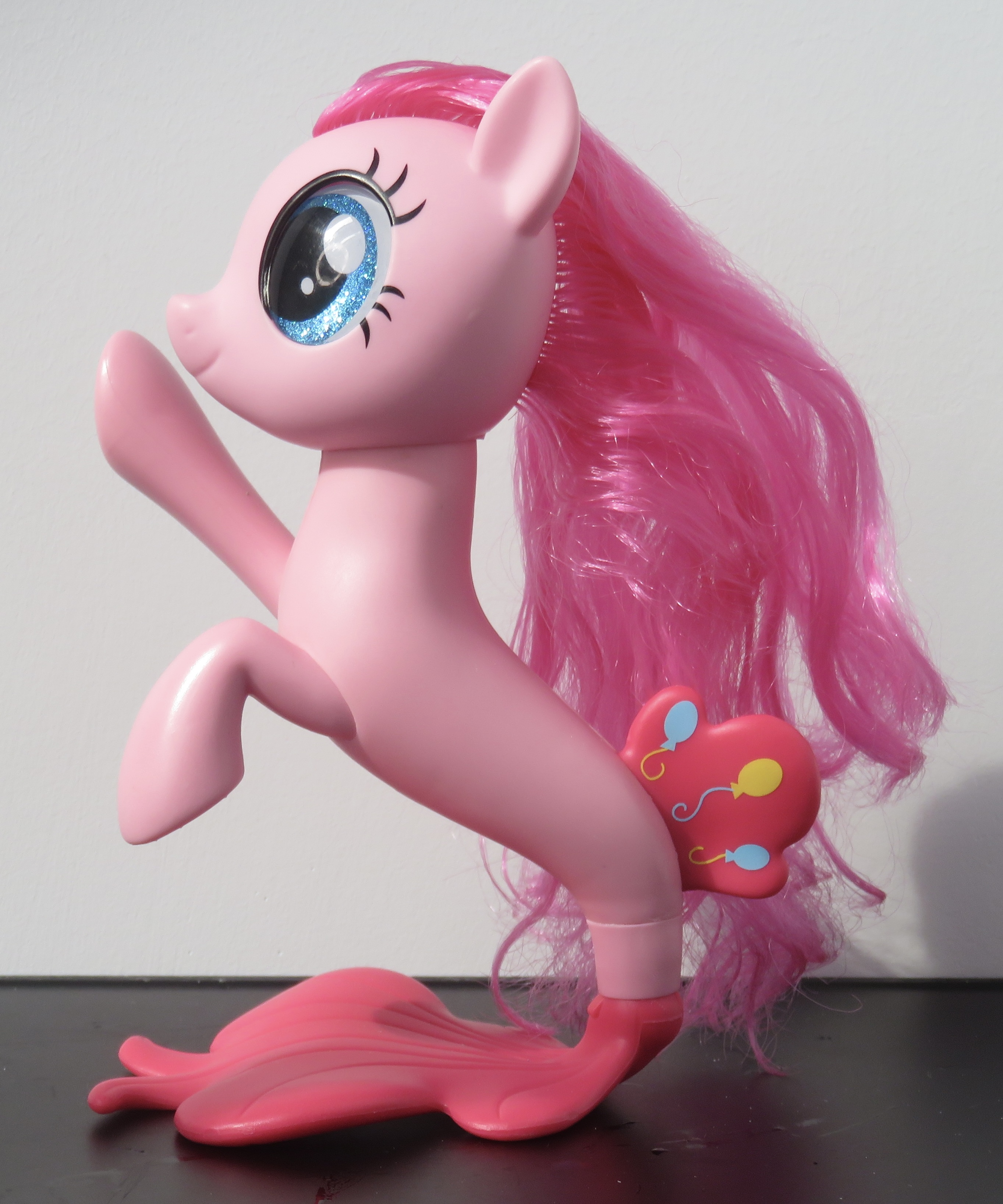 The flighted ponies have had their wings mutated into a big, translucent pair of fins on their dorsal surfaces. All of the ponies have their cutie marks present on a fin on near the base of their tails. Their tail fins match mane/tail colors of the ponies' normal horse-shaped designs. Their tail fins turn on a joint, which can swivel side to side and wiggle up and down. It seems best to use the tail as a base to stand the ponies up, as the joint on a few of them feels very tight, like it could be easily broken or bent out of shape if posed too much. All the ponies have pretty nice feeling hair, by modern My Little Pony toy standards. Not the greatest quality hair, but far from the worst. All of these ponies have huge, vibrant, inset eyes. Their irises are glittery, and the plastic insert makes them look glossy and three dimensional. A bit of a different look for a My Little Pony, but overall, it stands out and makes them look appealing, in my opinion.