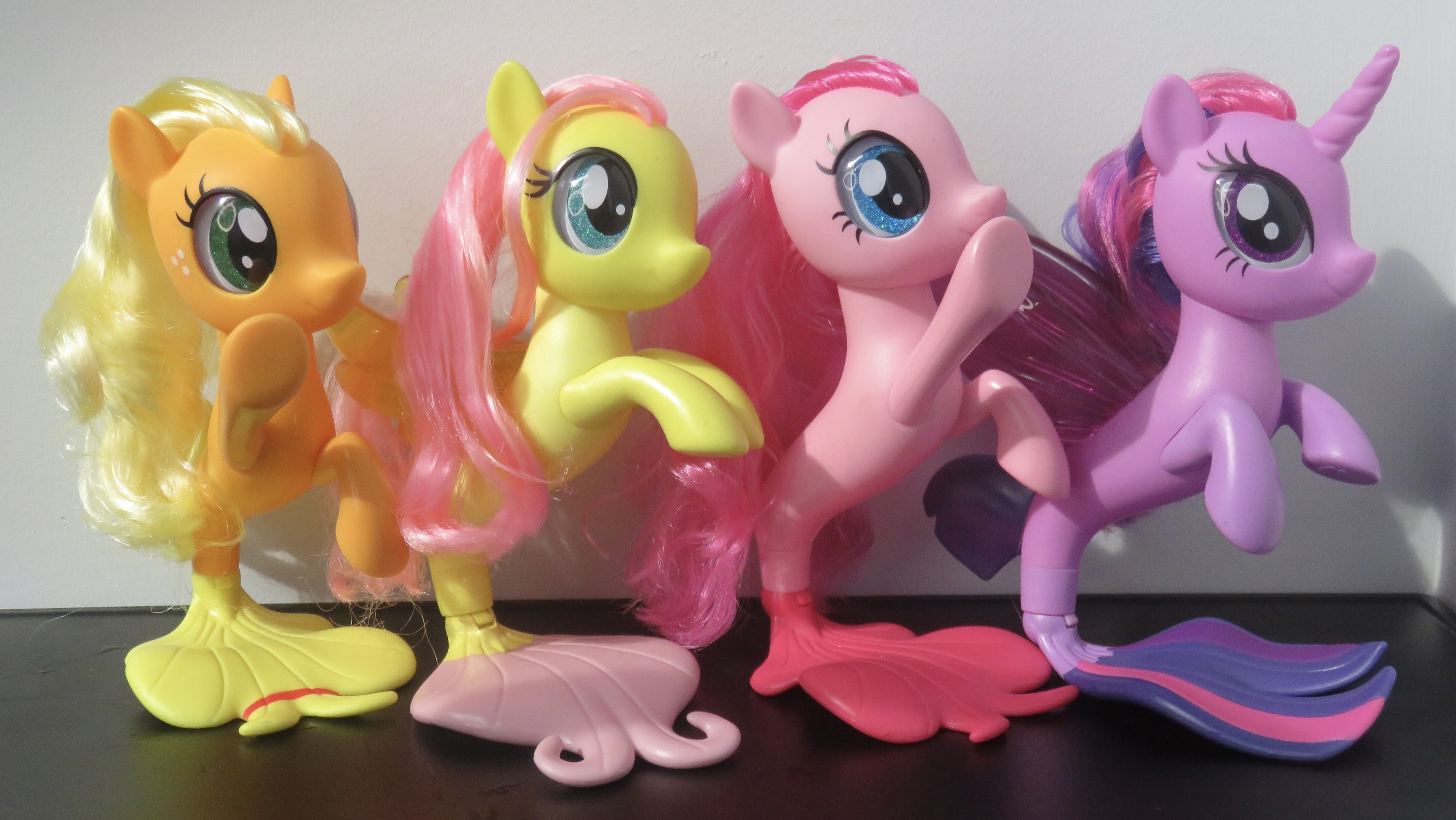 These ponies are based on the "seapony" incarnations of the Mane 6 characters, as seen in the My Little Pony: Friendship is Magic movie. During the movie, the pony characters are transformed into fantasy pony-seahorse creatures. Seaponies were first seen in the G1 cartoons, but had much simpler designs than the G4 seaponies do. Though these ponies were all found separately at various thrift stores, they originate from a 6-pack featuring all the main characters from the movie. This 6-pack was an Amazon (the online retailer) exclusive. Very similar incarnations of these figurines were also released in single packs, with a key difference between the multi-pack and single-pack releases being that the single-pack releases have a smattering of glitter on their backs. The toys from the single-pack line are referred to by the name "Glitter and Style Seapon[ies]".