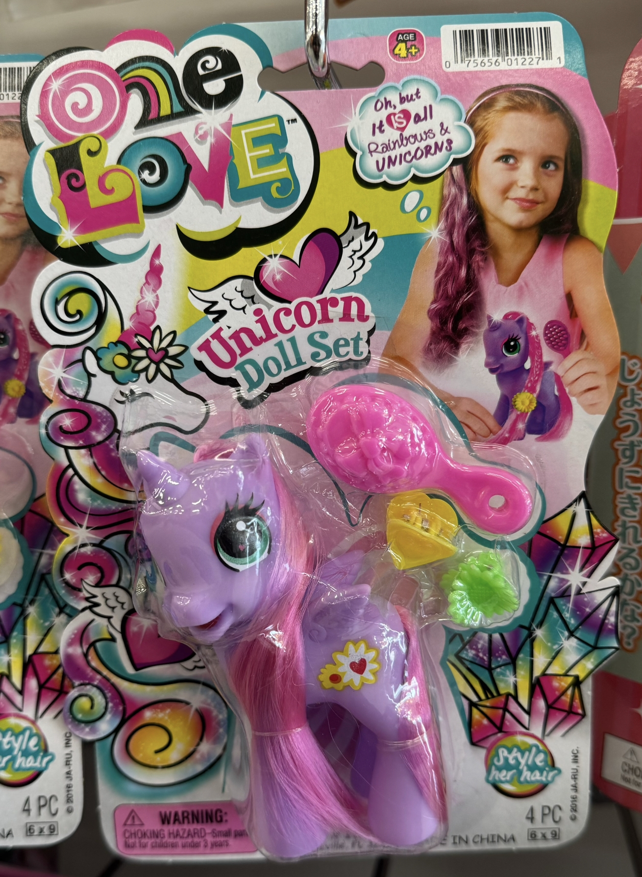 The "One LOVE" unicorns were found at Daiso, a Japanese dollar store that usually has a nice toy section in April, 2024. These ponies are inspired by the G3.5 style of My Little Pony toys that have bulbous heads punctuated by a bizarre beak-shaped snout. They look pretty cute, if low quality, and are available in three different colors. If my memory serves, the comb packaged with the ponies is highly remniscent of the G3 My Little Pony Brush, which was a round brush with a ribbon or some other detail sculpted on the back. One Love seems to make a lot of plays in the pony toy world, as I have stumbled across their products looking for the origin of the Alicorn Babies, and there is a pony figurine on my backlog that also includes One Love branding.