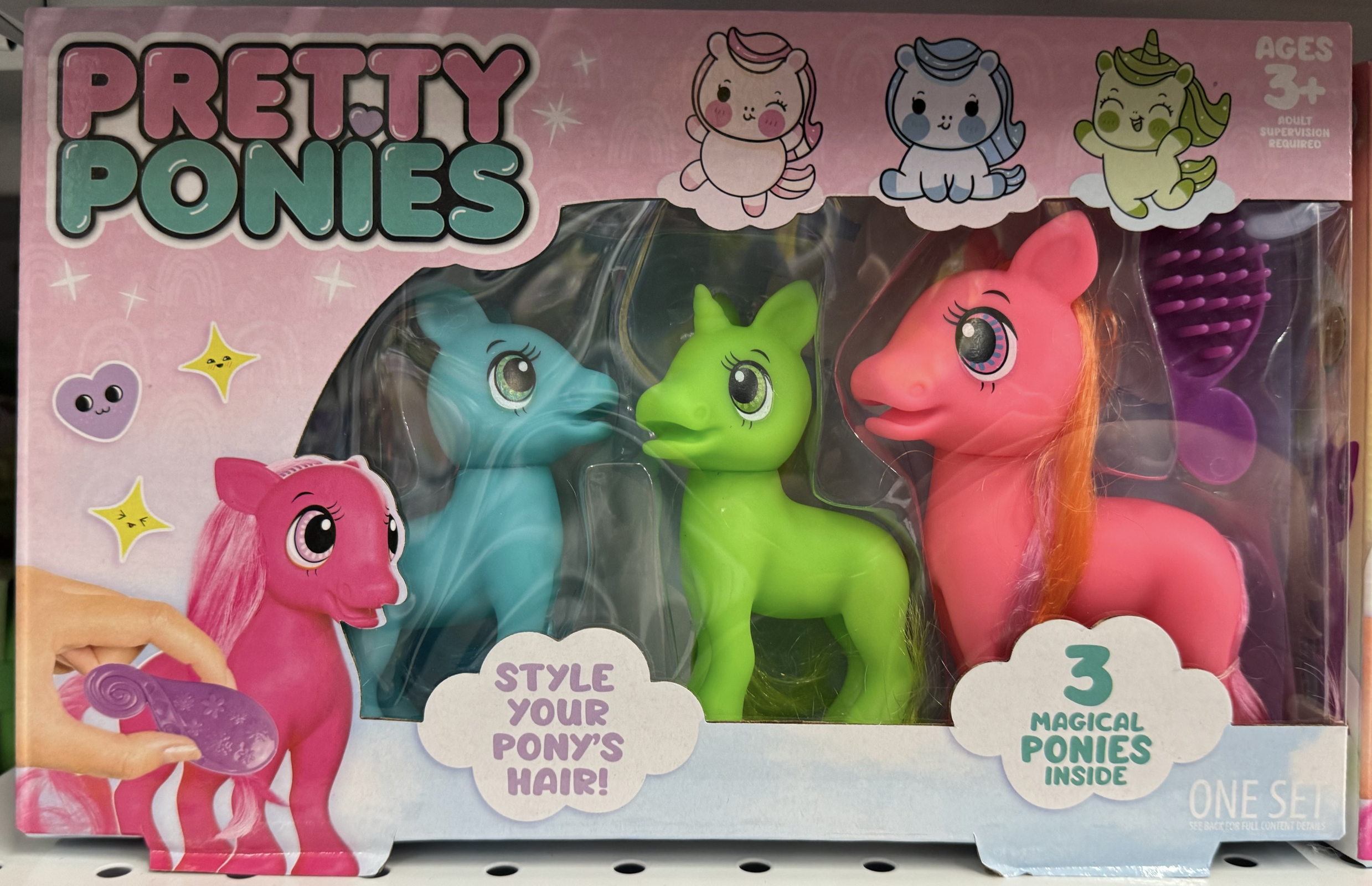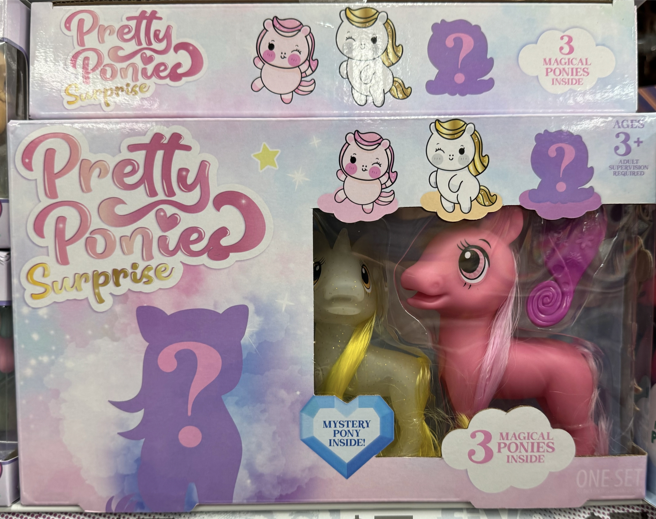 These Pretty Ponies were photographed back in October, 2023. The packaging containing the first group of ponies uses unicorn clipart with characters loosely corresponding to the toys that are included in the box. The ponies are deep, vibrant shades of blue, green, and pink-- the pink pony being the largest. The second box has similarly generic branding on the package. The box reveals two ponies: a large pink pony, and a unicorn rendered in semi-translucent white(ish) plastic with gold glitter embedded in its body. Included alongside the two ponies is a third mystery character, a pony obscured behind cardboard where the plastic window cannot reveal it. Not sure what the final pony looks like. It was a bit awkward in the toy aisle, so I decided to move on, leaving the pony's appearance a mystery. This was the first instance I have seen of the pretty ponies using any sort of gimmick.