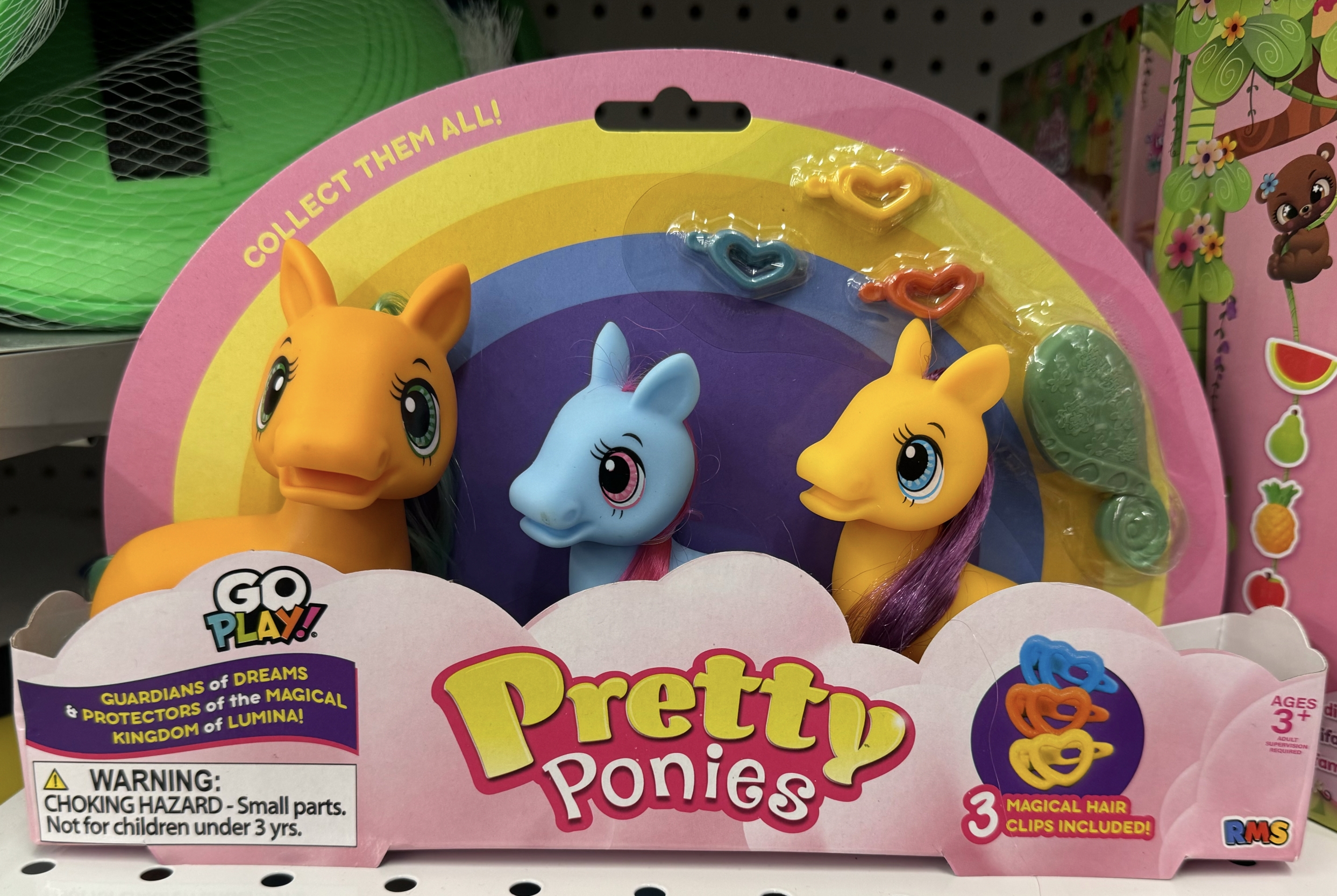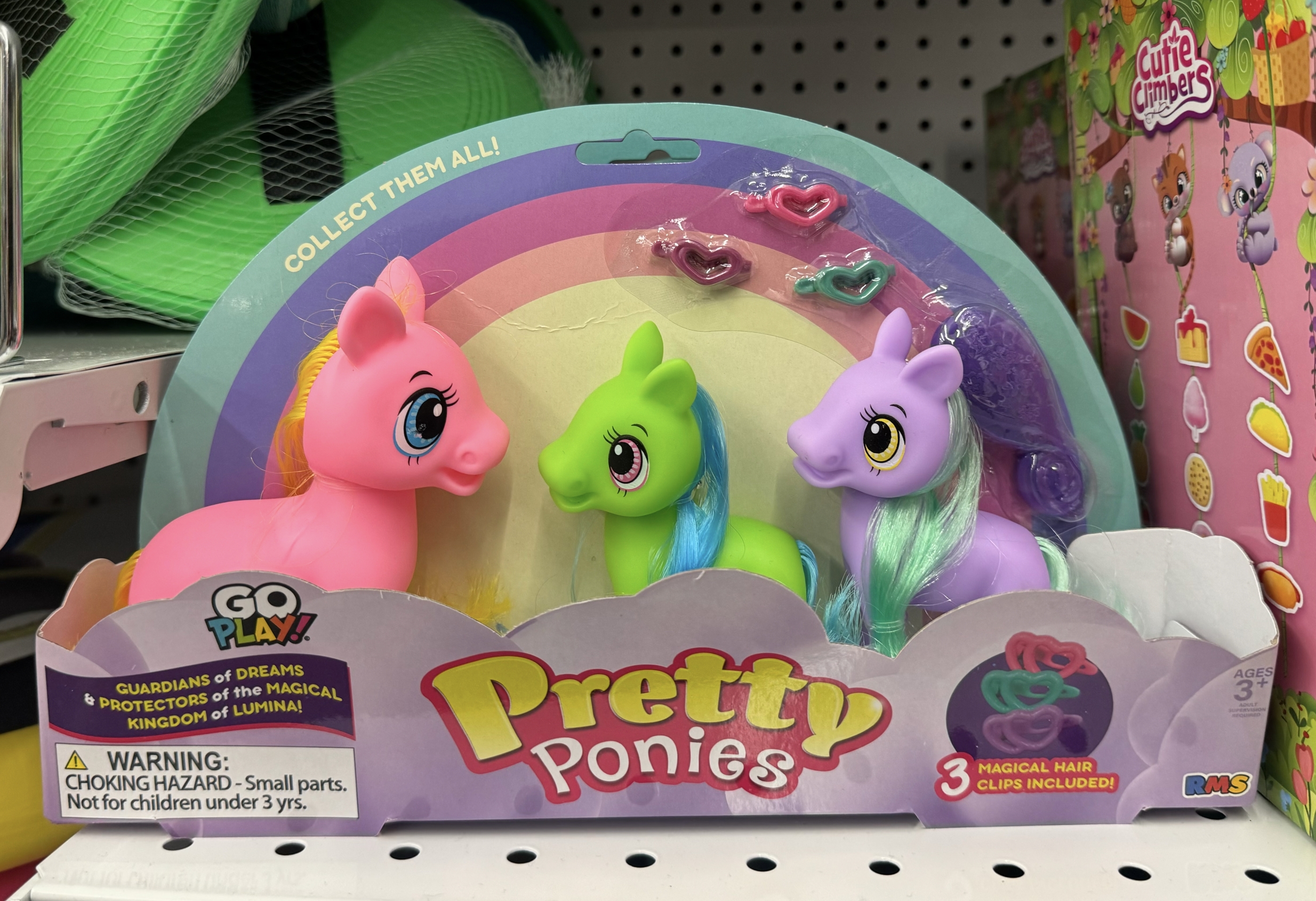 These ponies were seen in March, 2024 at Five Below. The ponies here are housed in a cardboard box with backing that resembles a rainbow. There is no plastic window on this box-- one could touch the ponies if they wished to inspect them further. Both color variations feature a large pony and two smaller ones, like the fully-enclosed pretty ponies did. These boxes tout "GO PLAY!" and "RMS" logos that were not as readily apparent on the other Pretty Ponies boxes. Though I have said it before, the appearances of the Pretty Ponies are unusual, as their gaping mouths unnerve, and their legs end in strangely oblate stumps.