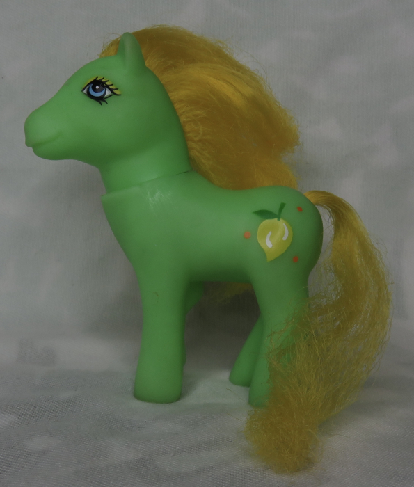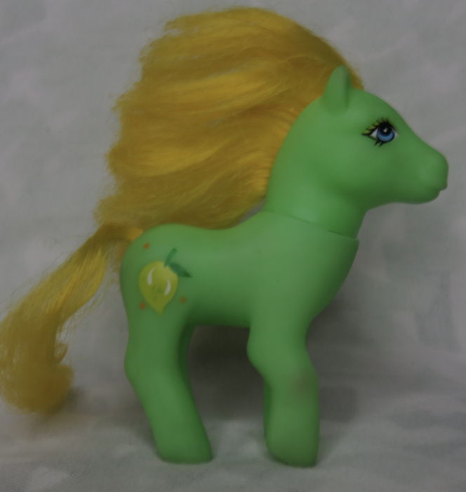 This Sister has excitable yellow hair, found at the thrift store with the equally as frizzy orange/white Sister. She has yellow eyeshadow that matches her mane, and blue eyes. Her bright green body color is eye-catching, and she shares a lemon symbol with her Sister-sister.