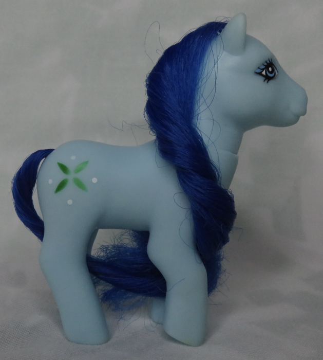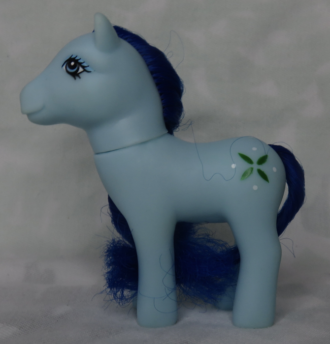 The combination of light and dark blue seen in this pony makes for a simple, but pretty color scheme. She has blue eyes and has blue eyeshadow that is difficult to differentiate from the color of her bdoy. This Sister has the mysterious four-lobed-shape (or plant?) symbol.