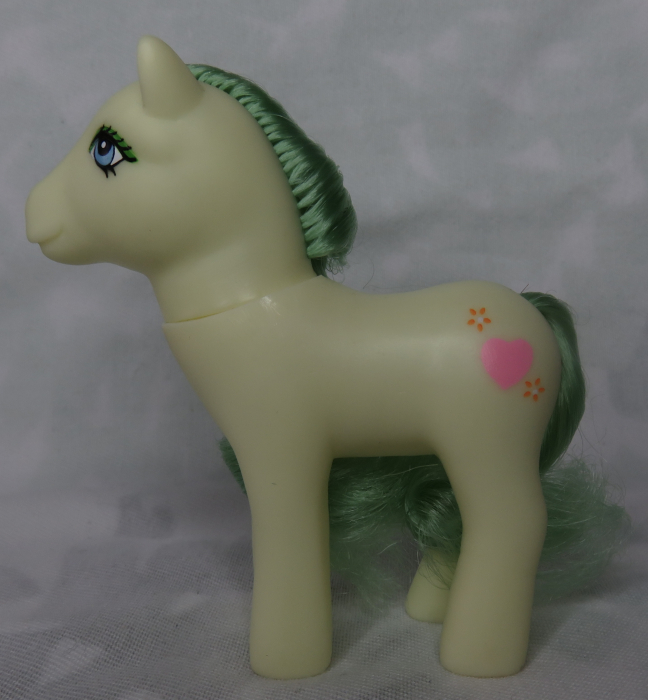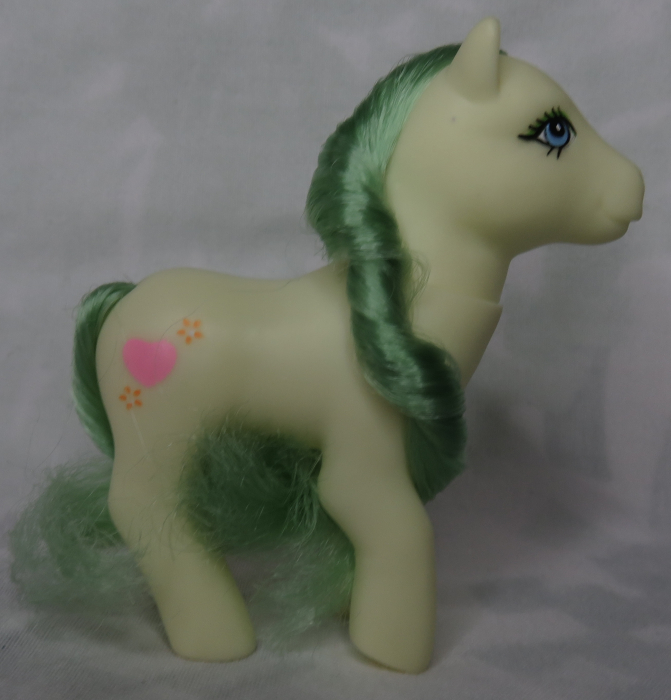 This mini Sister is my favorite. Her body is an unusual off-yellow, and she has a nice green mane. She has blue eyes and wears green eyeshadow that is similar to the color of her mane. Her hair is particularly long and soft. Her symbol is a bright pink heart overlapping burnt-orange flowers(?).
