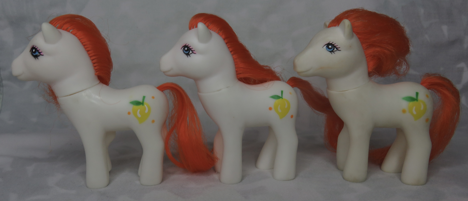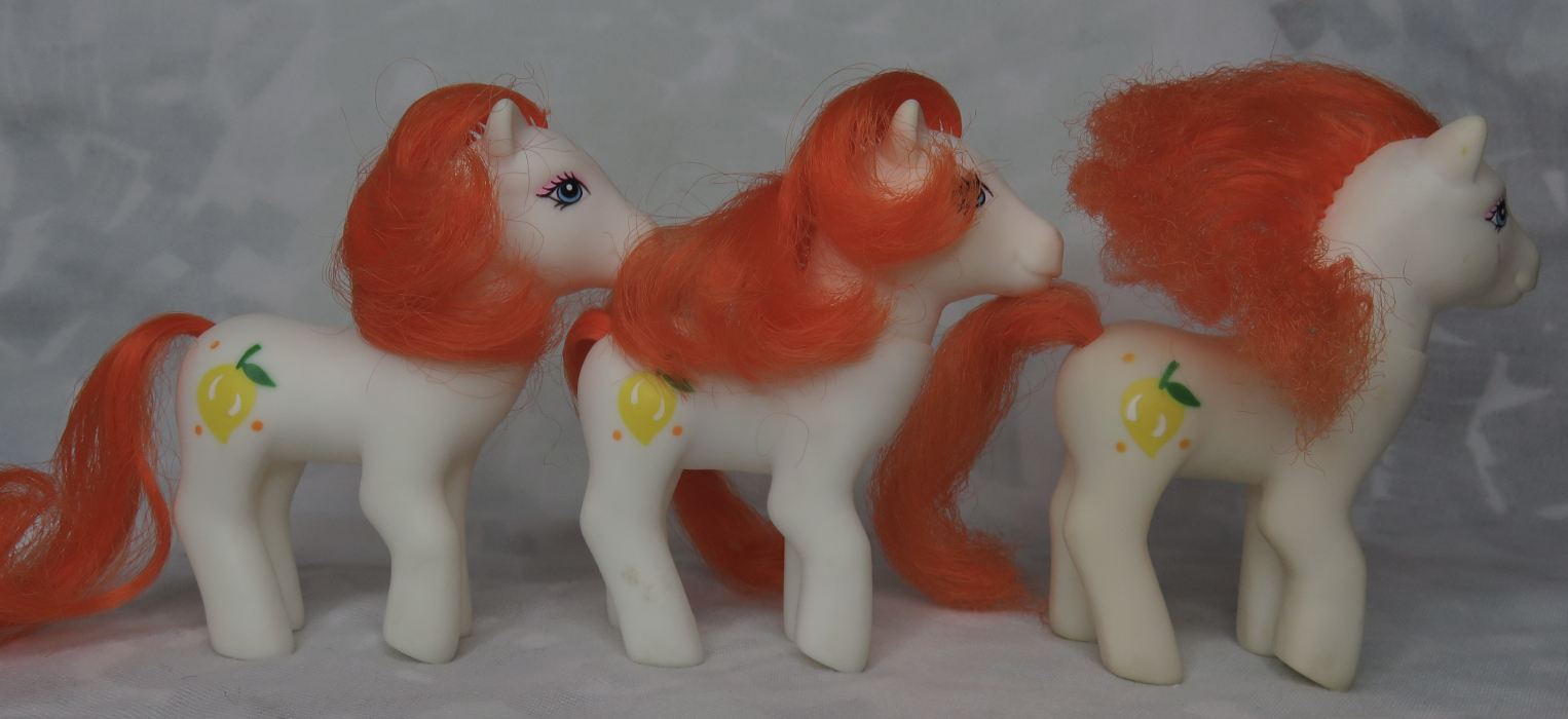 For whatever reason, this orange/white Sister with a lemon is the most common in my collection. She has pink eyeshadow and blue eyes. Here she is in varying degrees of frizziness/yellowing.